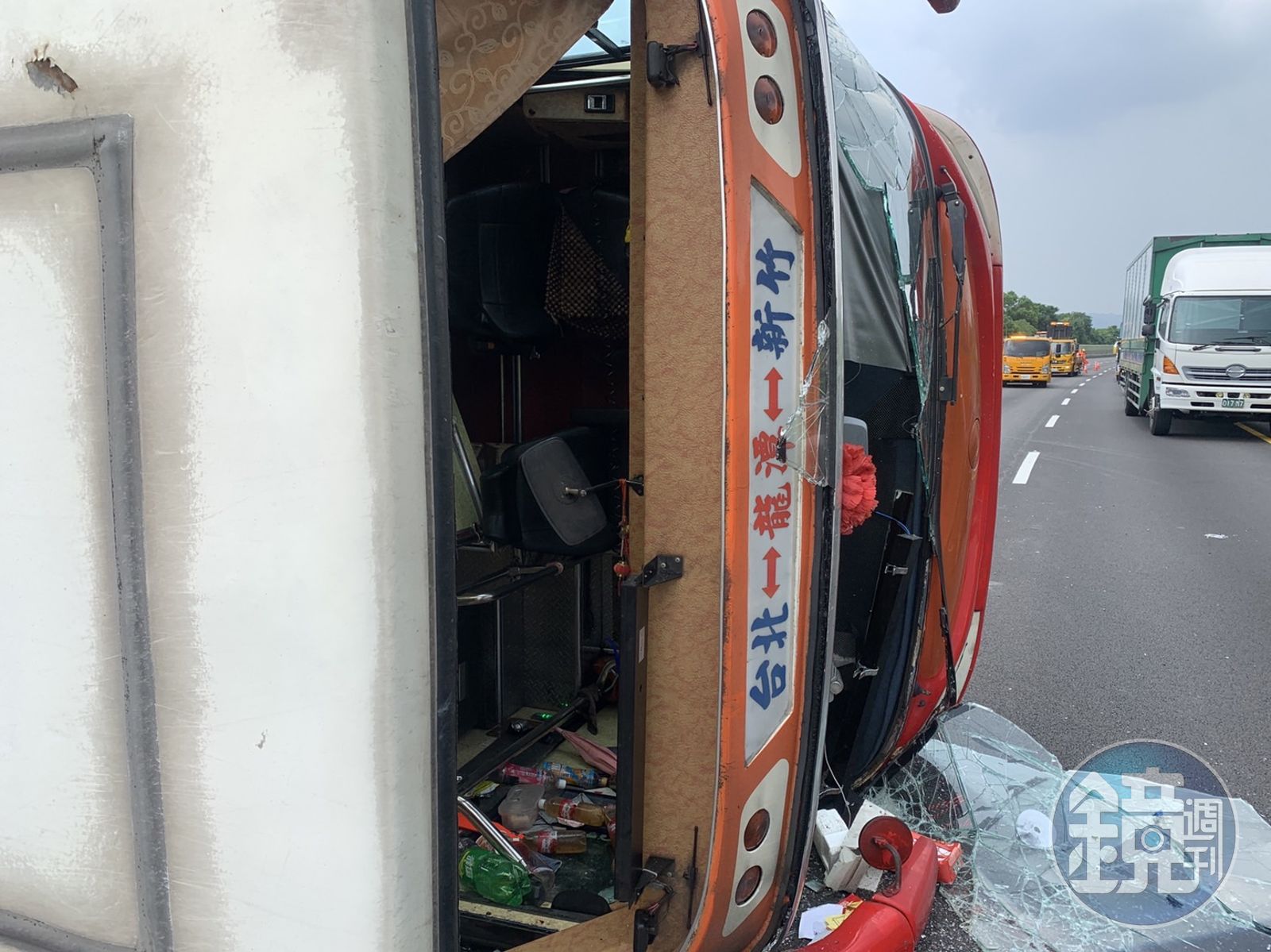 警方調查,蔡姓駕駛疑似因變換車道不當,擦撞由潘姓駕駛的自用大貨車左後車身後,導致失控翻車肇事,經查雙方駕駛均無酒駕,詳細事故原因仍有待進一步調查釐清。車禍事故造成客運橫躺路中,車輛零件及玻璃碎片、雜物四散,僅剩內側車道尚可通行,警方立即通知多部吊車,將肇事客運拖離現場,恢復交通順暢。