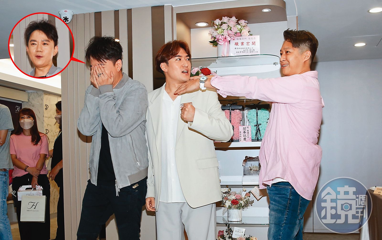 童星出道的沈建宏,曾在2005年與西瓜哥哥(李岳)、肯尼斯組成男團G-Boys,也因為投資的馥儷醫美診所開幕,讓3人時隔16年後再次合體,被問到還能跳16年前的舞蹈嗎?李岳尷尬笑說:「我今年40歲了!」小10歲的沈建宏卻接話「我可以」,氣得李岳直喊:「以前就想打他,現在還想打他!」而肯尼斯則學殭屍作勢掐脖子,懂的人就知道「暫時停止呼吸」保命!(捏鼻子)
