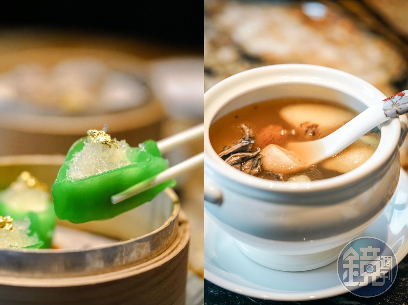 坐在可俯視城市高空景觀的包廂圓桌前,窗外是夏季專屬的藍天白雲、晴空萬里,眼簾下就是都會感十足的信義區景緻。這麼熱的天氣,當然先派涼菜「麻婆冷豆腐」和手工港點「鵪鶉蛋燒賣」、「金箔燕窩龍蝦餃」、「賽螃蟹春捲」繽紛開場,挑醒味蕾。