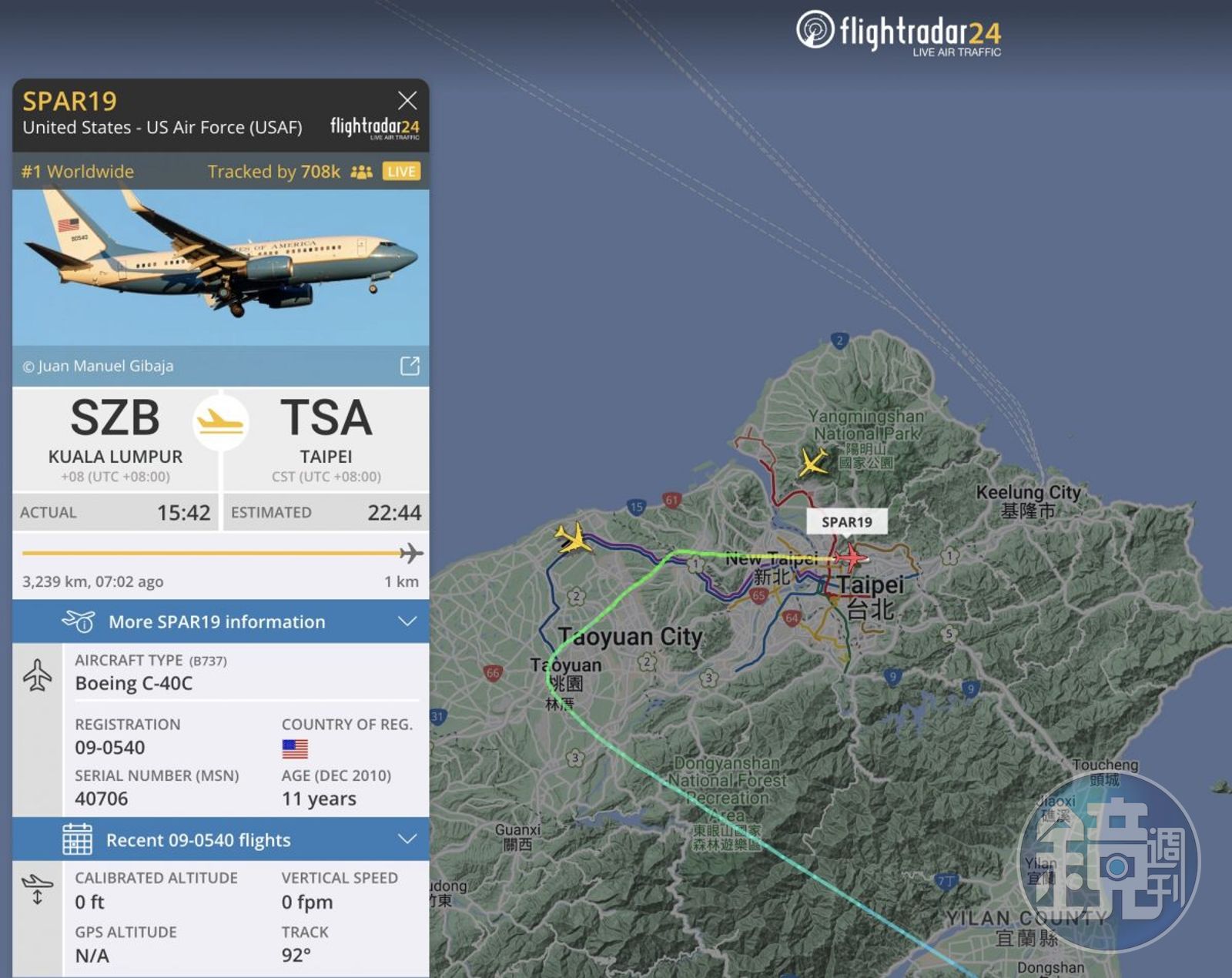 飛航網站Flightradar24指出,裴洛西專機從起飛後,線上追蹤人數一直維持在20萬以上,當班機降落台北松山機場時,追蹤人數更衝破70.8萬人,該網站統計,在7小時的飛行過程中共有292萬人追蹤過裴洛西專機。