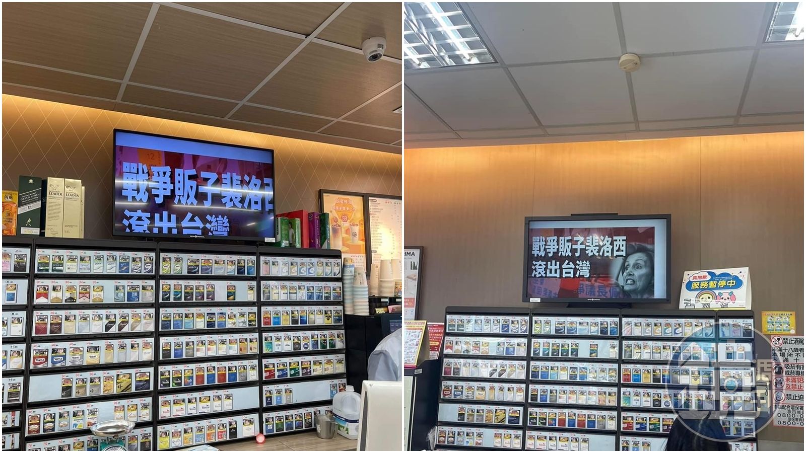 7-11門市電視螢幕驚見「戰爭裴洛西滾出台灣」,民眾見狀在網路上熱議。(翻攝自爆廢公社)有網友於臉書社團「爆廢公社」貼出照片,赫然見到7-11結帳櫃台後方的電視螢幕上,竟以激烈言詞寫著「戰爭販子裴洛西滾出台灣」,讓目擊的民眾相當傻眼,陸續也有其他人貼出類似畫面稱非單一門市受害,也有網友聲稱「我看新竹這邊的確實也關了,螢幕的連接線也都拔了!」。