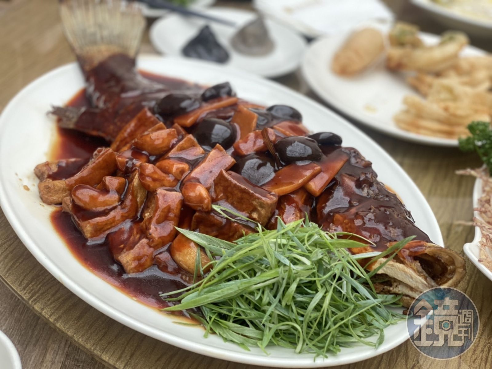 靈感來自上海本幫菜裡紅燒大黃魚的「山泉鱸魚燒豆腐」,選用山泉水鱸魚取代黃魚,加豆腐、春筍、香菇燜燒收汁,肉質軟嫩富彈性,並由專人分菜,每人分得一碟魚肉,肉質軟嫩富彈性,好吃極了。