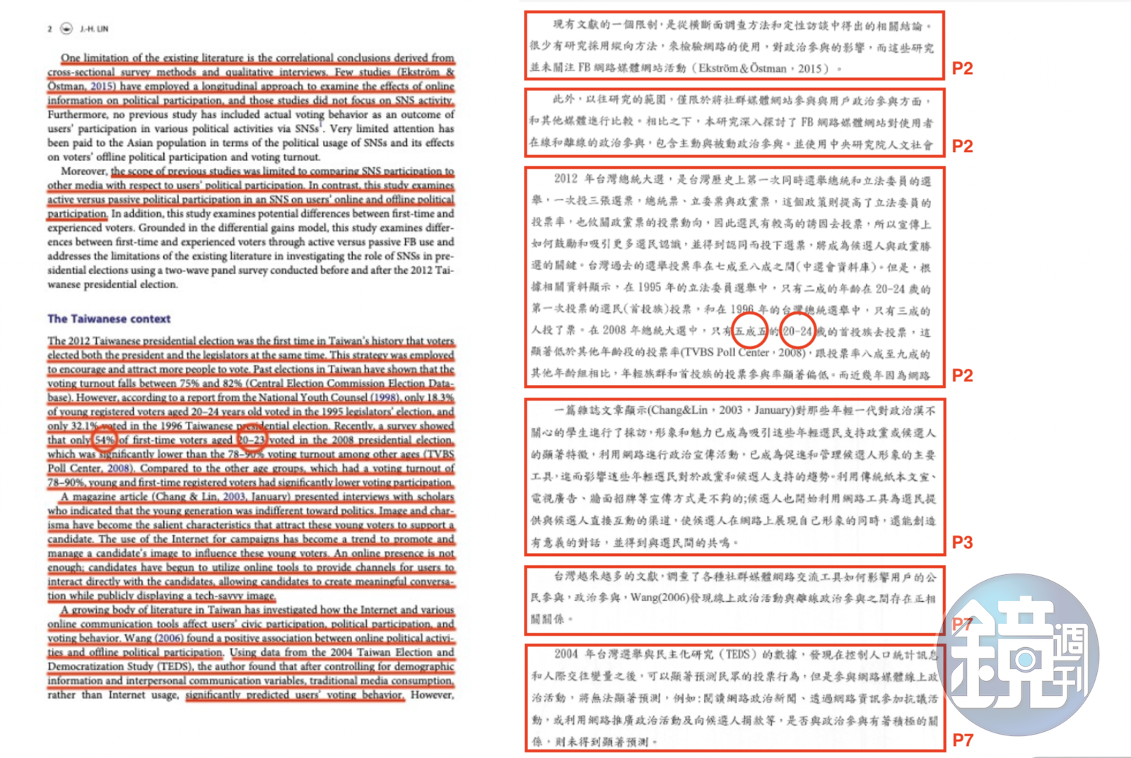 但經本刊比對(如下圖),林杏兒2020年發表的《FB網路媒體使用與政治參與關係之研究》論文,確實有多處內文與原著林日璇2016年在《亞洲傳播雜誌》發表的英文論文《Differential Gains in SNSs: Effects of Active vs. Passive Facebook Political Participation on Offline Political Participation and Voting Behavior among First-time and Experienced Voters》高度雷同。