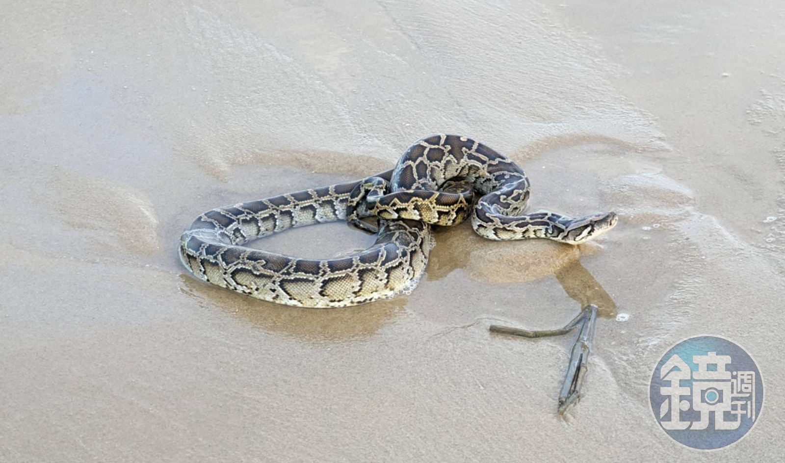 有網友捕捉到今門沙灘一條大蟒蛇的身影。(翻攝野生蛇相)有網友在臉書社團「野生蛇相」發文,朋友昨日在金門海灘挖花蛤時,突然發現身邊一條大蟒蛇,「這位仁兄大喇喇的從他們身邊滑過」,只見超巨身形溜的又快又急,不一會兒時間就消失在眼前。 網友補充說道這條蟒蛇「腳步」相當著急,朝著「台灣海峽」游去,短短13秒影片原本還在沙灘上的蟒蛇,一溜煙就滑進台灣海峽,讓不少網友笑說,在這敏感時刻連蟒蛇都知道要「逃命」,原po還笑說,「連蛇都知道要趨吉避凶、投奔民主自由^Q^」,其他網友也忍不住揶揄「都沒有人懷疑是裴媽的業力造成的異象嗎?」