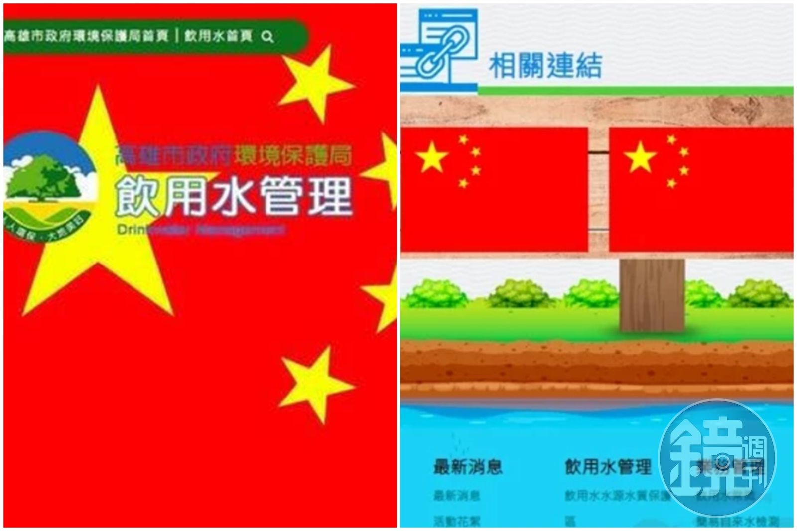 高市環保局飲用水網站昨晚遭駭,被掛滿五星旗,至今仍未修復完成。(翻攝自高雄市環保局飲用水網站)發布時間:2022.08.05 09:12 臺北時間