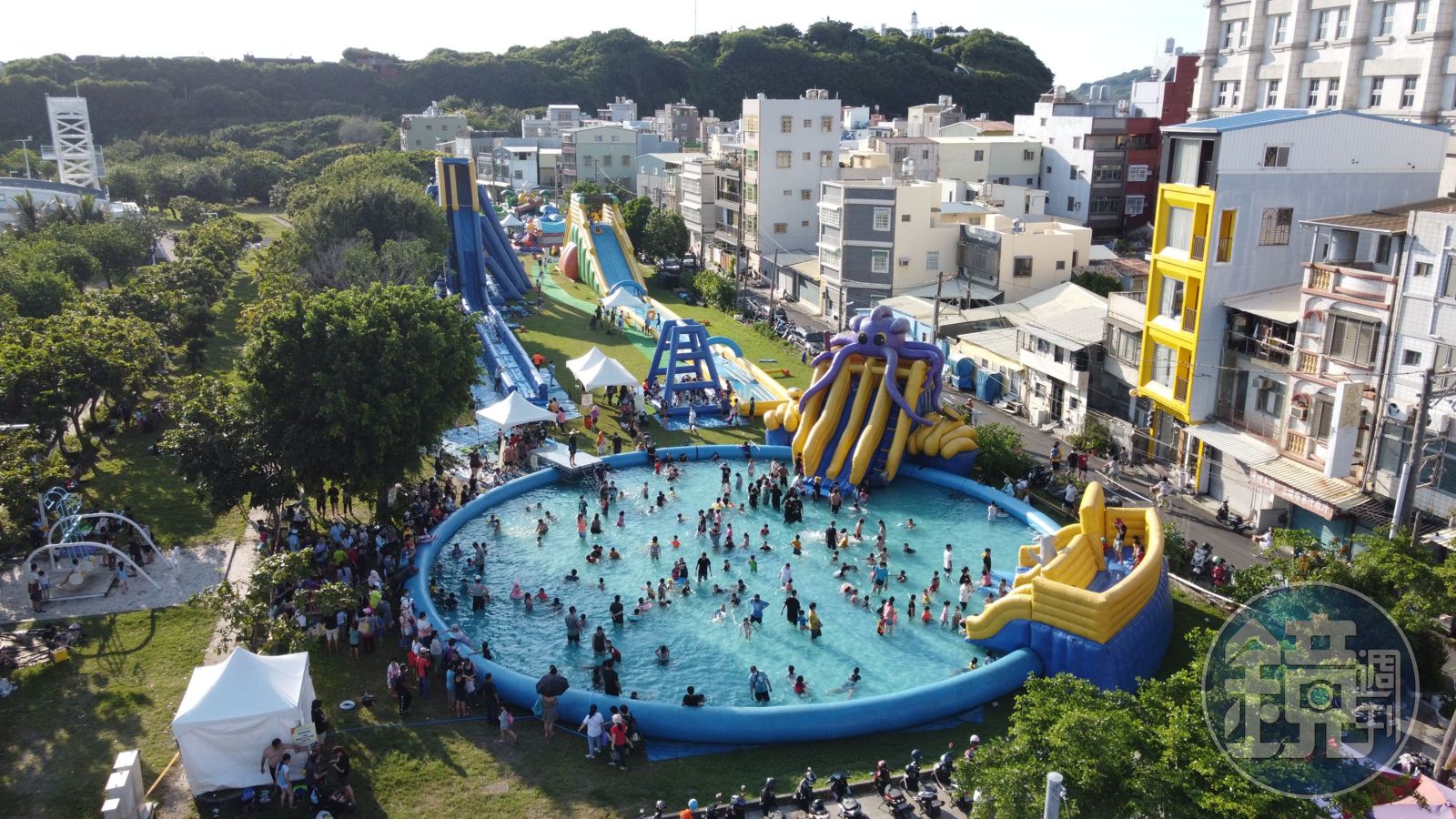 其中急速滑水道最為刺激,也最受到歡迎,現場玩經常需要排隊。由錄影的民眾實測,15公尺高的滑水道「從出發到落地」僅需要3秒鐘,難怪民眾尖叫聲連連。除了體驗俯衝而下的清涼暢快感,也有許多小朋友攜帶自己的水槍、游泳圈入場玩耍。若不方便下水的民眾,也有其他氣墊遊樂設施可以體驗,像是熊貓竹林樂園、斑馬親子樂園、海洋親子樂園及工程師跳床等,讓小朋友放電放得超開心。唯一特別注意不能攜帶尖銳物品,以確保氣墊設施安全無虞。