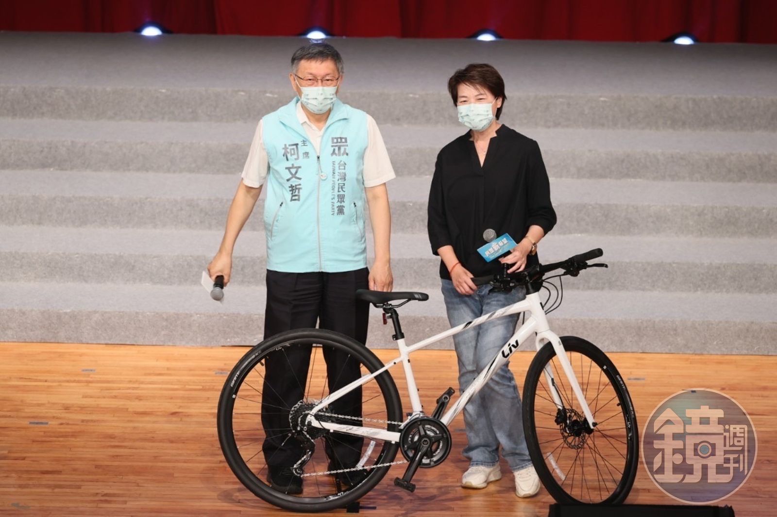而此後,台上播放慶祝影片,出現柯文哲過去騎單車挑戰「一日雙塔」畫面,接著柯文哲更是牽著單車出場,黃珊珊看到此畫面後,竟突然淚崩,直到燈光亮起都仍在拭淚,柯文哲則稱要把單車交棒給黃珊珊,頗有傳承意味。