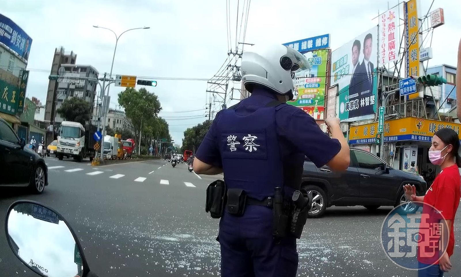 眼見現場交通大亂,清潔隊員又無法馬上趕到,現場員警便主動向周遭店家借用掃帚,頂著豔陽、穿著防彈衣在道路上揮汗清掃,將碎玻璃集中在紙箱內並移至路邊,約20分鐘就將現場狀況排除。