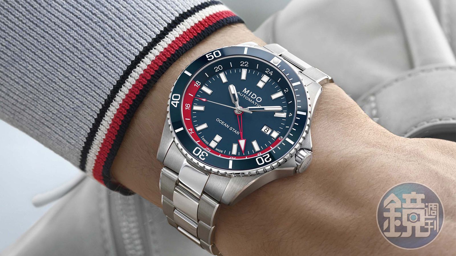 Ocean Star是MIDO現階段的當家人氣王,過去他們就曾推出過GMT兩地時間的功能,像是藍黑雙色的搭配,但出現像這次百事圈這種紅藍的強烈對比色倒是第一次。因為Ocean Star本身是潛水錶,所以錶圈還是要讓出來,保有它用於計算海底停留時間的提醒作用,所以它的24小時圈是設計在面盤外緣,而且它的字體設計相對比較圓潤,所以雙色的交接分界線,也相對不會有和線融為一體而難以辨識的問題產生。紅藍的百事圈向來是GMT功能裡很受歡迎的配色,MIDO這次還為了它推出紅藍配色的NATO帶,而且配備快拆設計方便替換的錶帶,加上陶瓷圈、防水200米和動力儲存80小時的Ocean Star既有優勢,一上市詢問度就居高不下,持續坐穩MIDO的人氣王寶座。