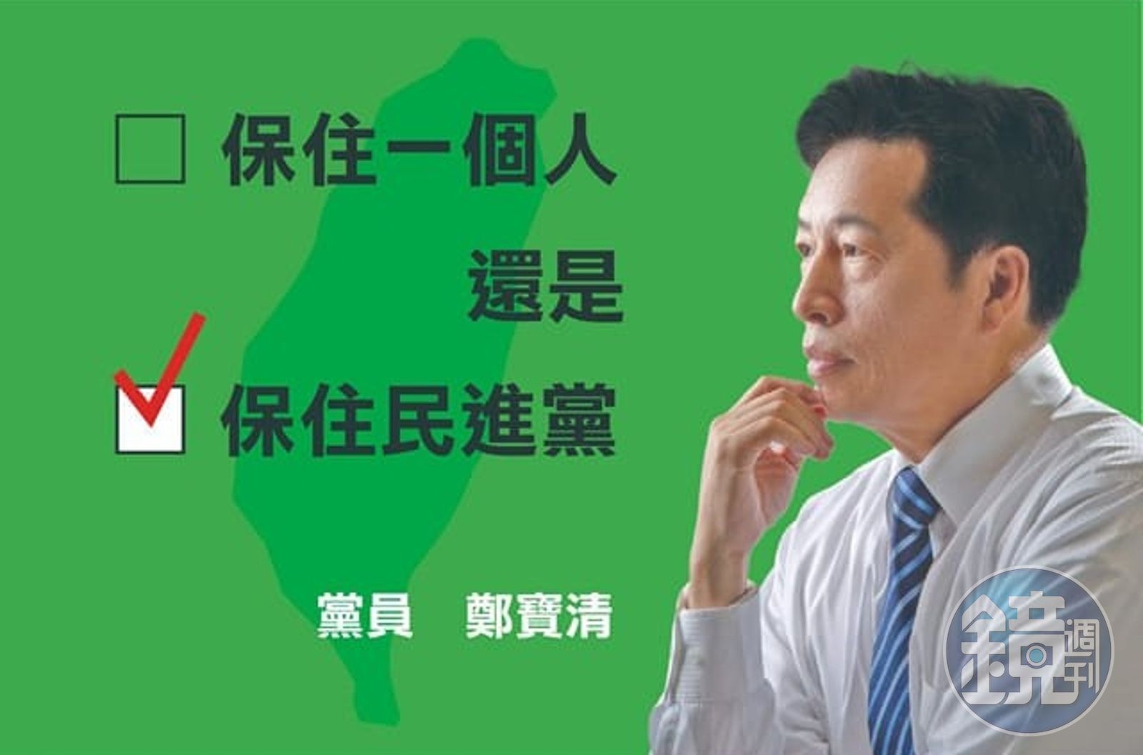 鄭寶清除了po出該篇文章外,他還附上一張選擇題圖卡,上頭寫著「保住一個人還是保住民進黨」,而他也直接填好作答,將紅色的勾勾選擇在「保住民進黨」的位置,同時附上自己的照片並署名「黨員 鄭寶清」。
