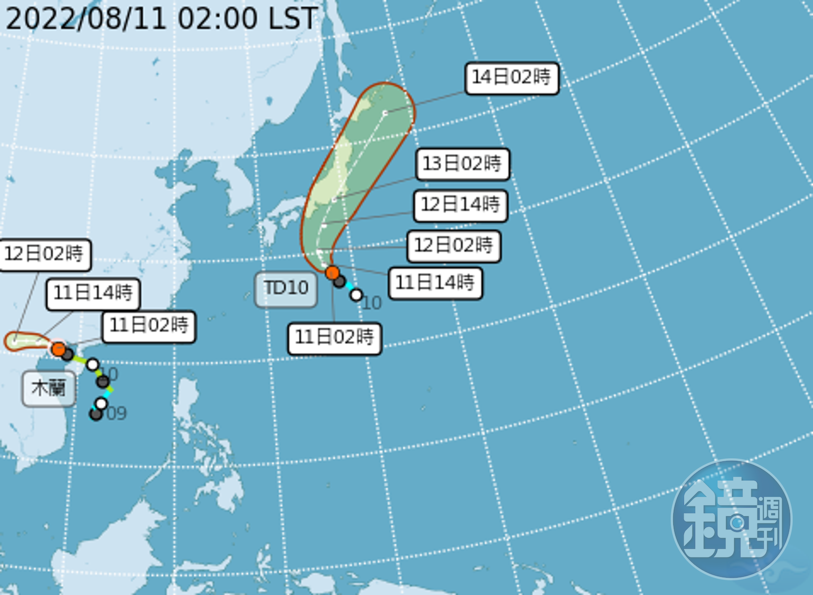 另外,昨在日本東南方一熱帶性低氣壓TD10生成,氣象局表示最快在今天下半天增強為「米雷」颱風,而已經生成的第7號颱風木蘭,位於鵝鑾鼻西方1,350公里處,預測朝西方向往中南半島北側前進,對台無影響。若第8號颱風「米雷」生成,有機會看到雙颱在海上共舞的畫面。