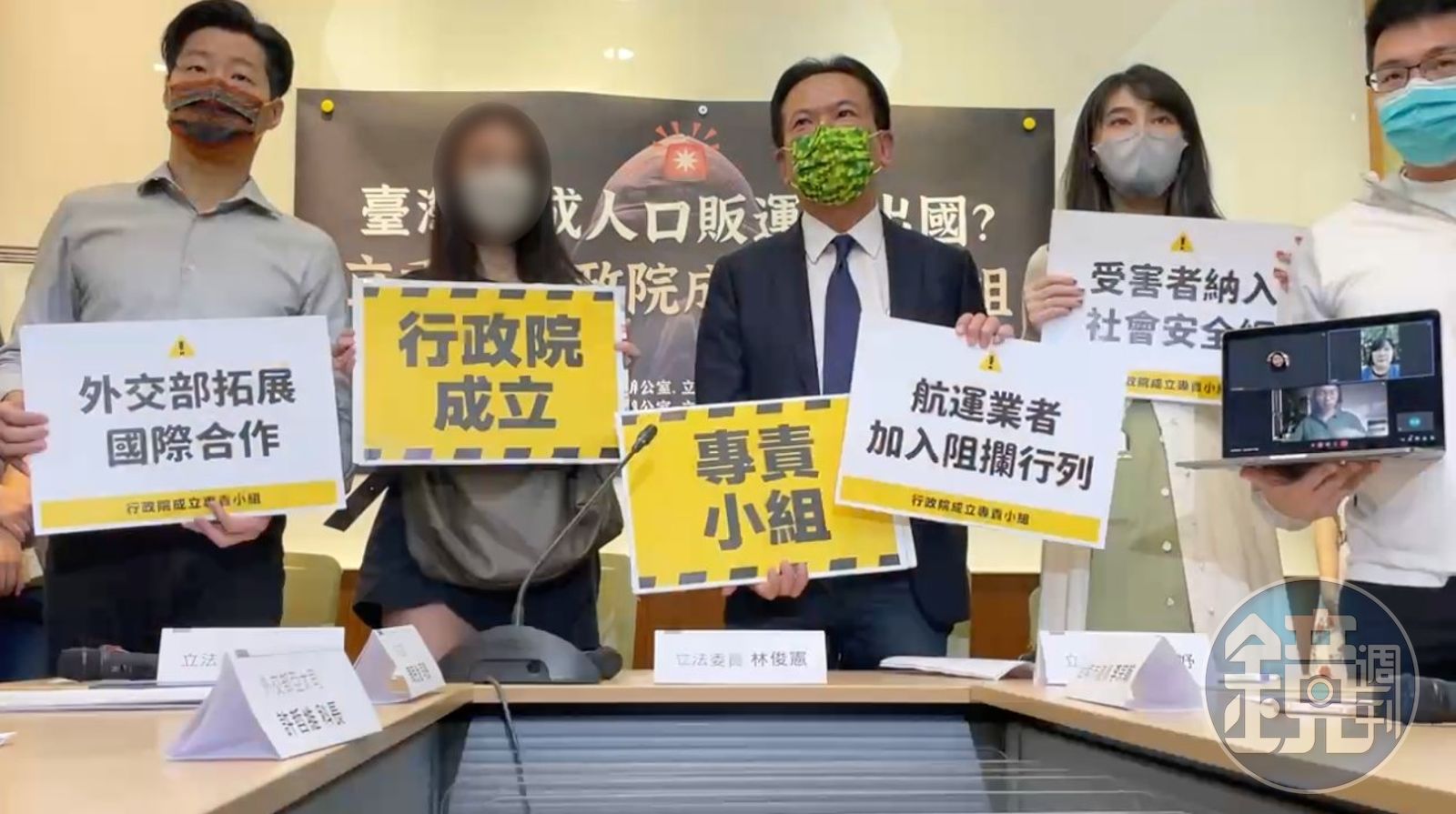 民進黨立委林俊憲、賴品妤、伍麗華與無黨籍林昶佐、受害者皮皮(化名),以及外交部亞太司周民淦、警政署刑事局國際科科長李泱輯等人共同舉行記者會。皮皮在記者會上說明自己7天宛如噩夢般的經歷,透露她先前就有前往菲律賓從事類似工作的經歷,此次是朋友介紹柬埔寨工作機會,雙方聊了1個月後,她卸下心房決定前往,未料抵達後才知是從事詐騙,倘若不從就會被毒打與轉賣。