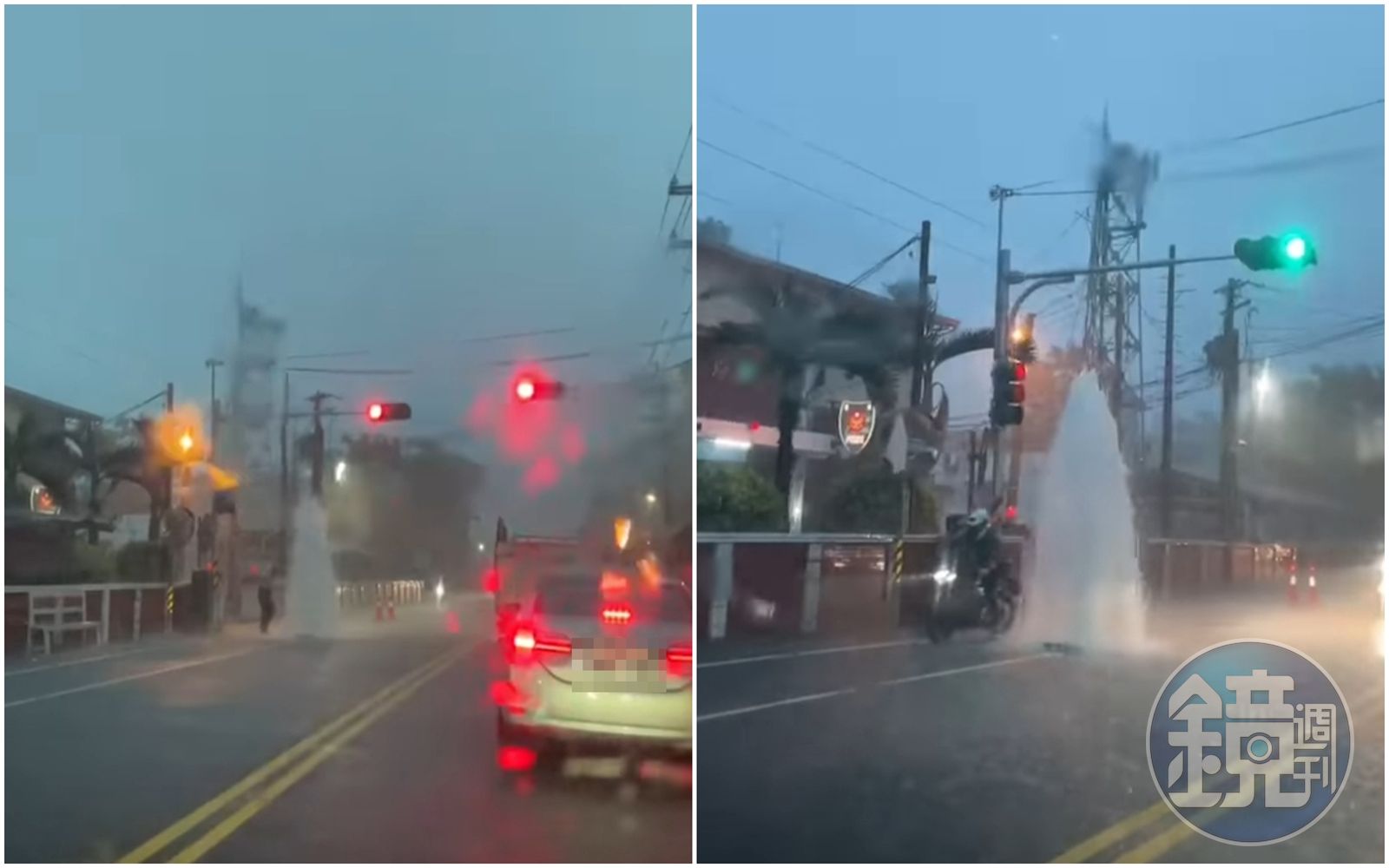 今天高雄也傳出類似淹水的狀況,旗山區圓潭派出所前甚至還冒出巨大噴泉,讓用路人都必須小心閃避經過。許多民眾誤以為路上噴泉與大雨有關,不過據《蘋果新聞網》報導,警方透露水柱是自來水公司維修水管洩壓,造成管線破裂,不是大雨造成,後續也已派出備勤人員前往進行交管。
