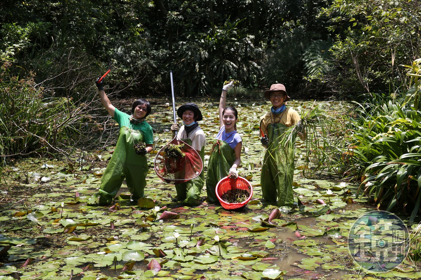 我換上青蛙裝試著清理濕地,才發現一切沒有想像中的容易,濕地的底部泥土黏人,雙腳容易陷入,也可能會被蓮花梗絆住,舉步維艱。工作人員一邊講解、分享園區趣事,過程中笑料不斷,讓第一次走入濕地的我,也覺得新鮮好玩,渾然不覺辛苦。