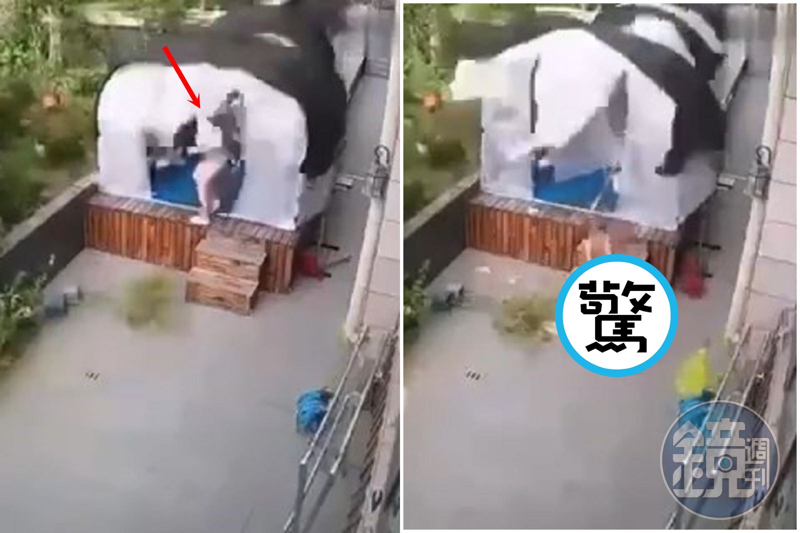 女子為了躲避大風,讓整理工作能進行得更順利,於是往後退一步,卻沒想到天外飛來一個磚塊,更硬生生直接砸中女子的頭部。女子當場被砸暈倒地,監視器畫面也可見女子一動也不動,最後更傳出女子不幸身亡。