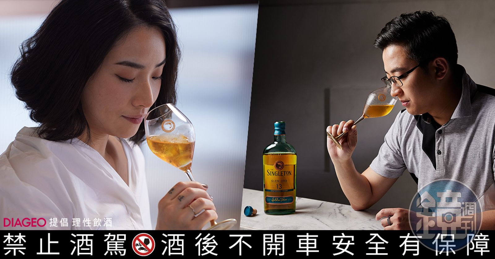 在燈光下輕輕搖晃酒杯,Ching驚喜分享:「它的顏色好特別,是金黃蜂蜜的色澤,正因為它是以醇金貴腐桶過桶,所以酒體顏色加冰後很美,我認為它是很容易被辨別的威士忌。」湊近一聞,就辨認得到出脫的豐沛果香,無論是色澤、香氣,蘇格登「醇金 13 年單一麥芽威士忌」都讓人驚豔。