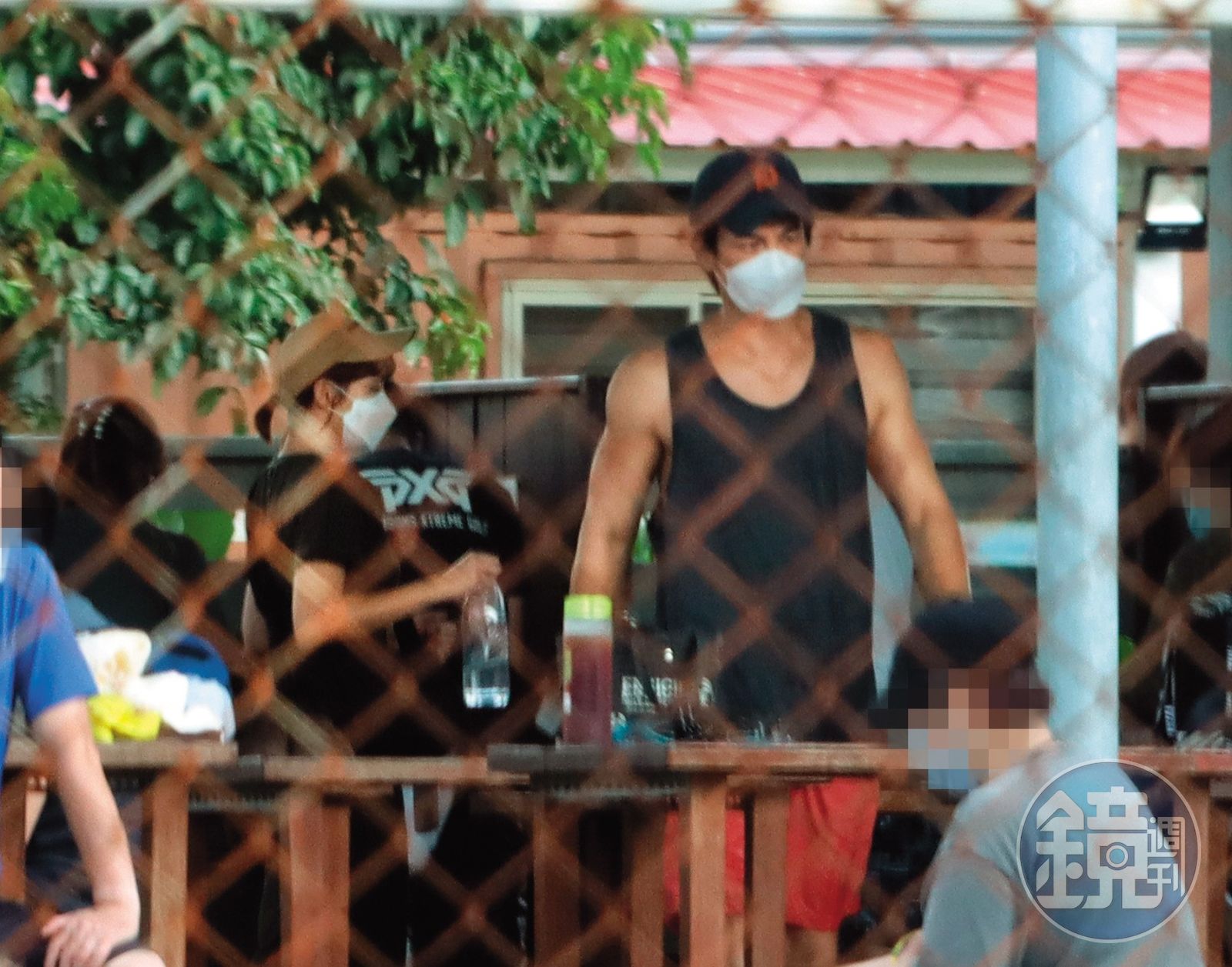 8月10日17:01,陳志強跳進戲水池陪「黑秀」玩水。8月10日下午4點左右,本刊直擊陳志強與曾智希開著黑色賓士車,從新家社區駛出後,車子直接開上建國高架橋再接高速公路,半個小時後車子駛進位於桃園市蘆竹的狗老大寵物度假會館。