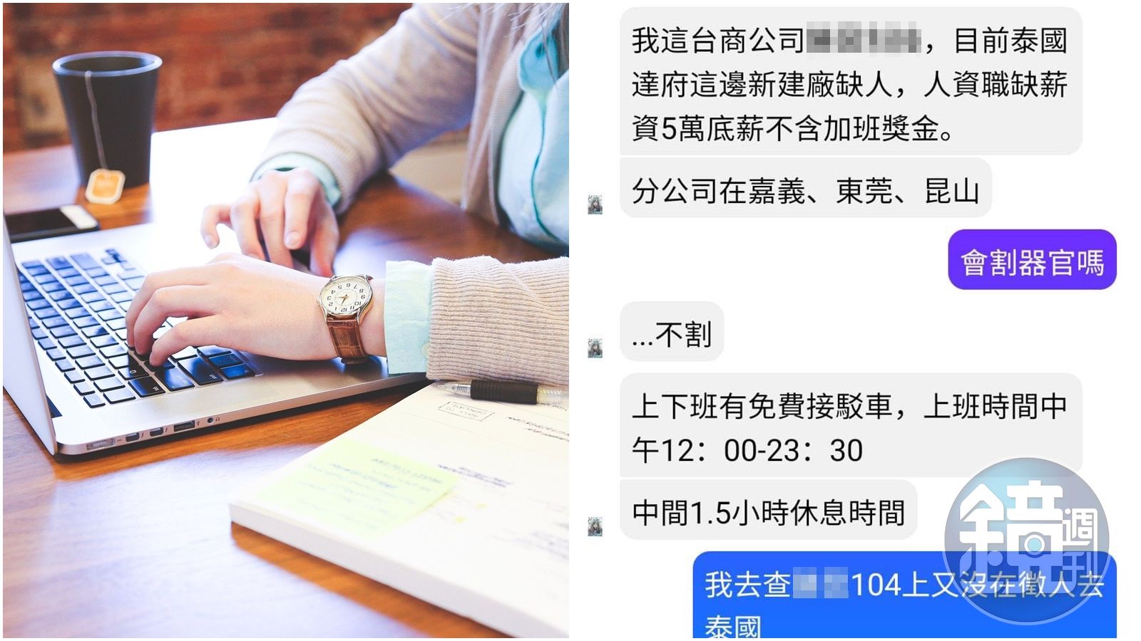曝光對話可見,1名自稱上市公司人資聲稱「目前泰國達府新建廠缺人,人資職缺薪資5萬底薪不含加班獎金」,網友立即反問「會割器官嗎?」,對方故作鎮定繼續照流程說明工作內容,但網友經查詢後打臉「104上又沒在徵人去泰國?」。