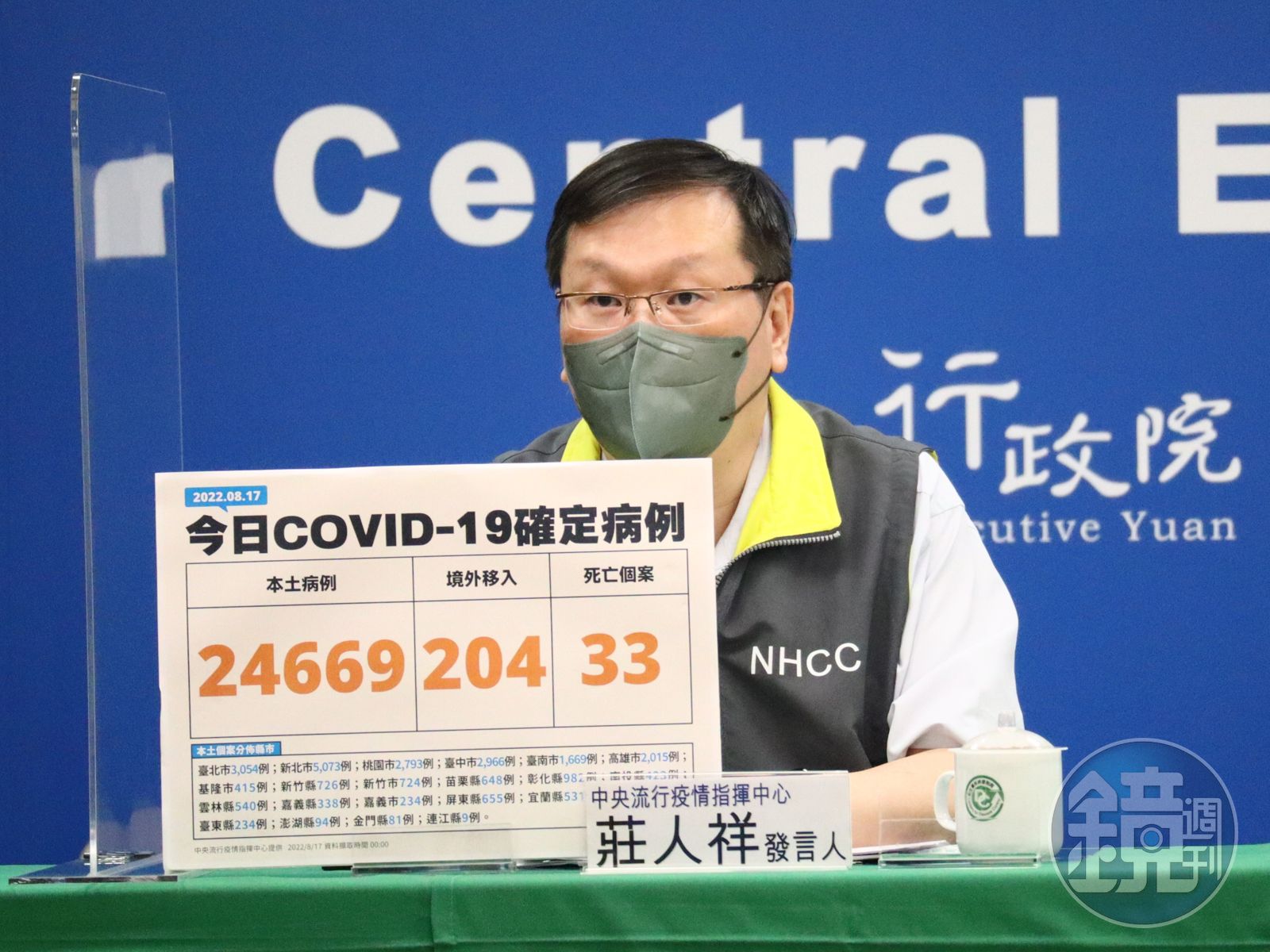 指揮中心指出,今日新增33例本土病例死亡個案,為19例男性、14例女性,年齡介於50多歲至90多歲以上,皆屬重度感染、32例具慢性病史、23例未接種3劑COVID-19疫苗。確診日介於今年5月11日至8月13日,死亡日期介於5月11日至8月14日。