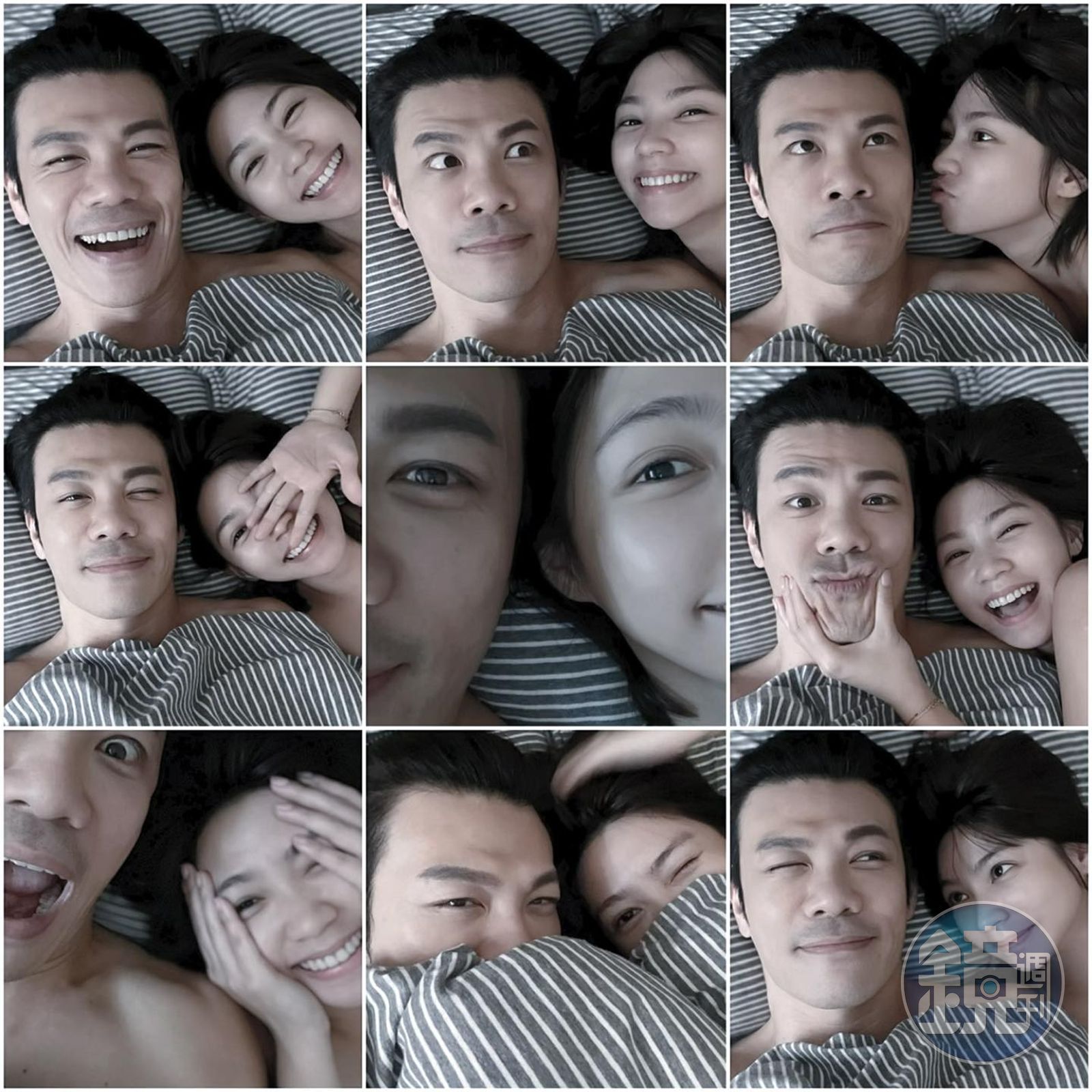 今天結婚消息曝光後,小倆口也在臉書發出連9張的同床自拍照,證實兩人結婚的消息了。照片中曾智希依偎在陳志強身旁,一下捏著老公的下巴,一下嘟嘴、一下又露出鬼臉;而一旁的陳志強則沒穿上衣,僅用被子蓋著身體,露出燦爛笑容。