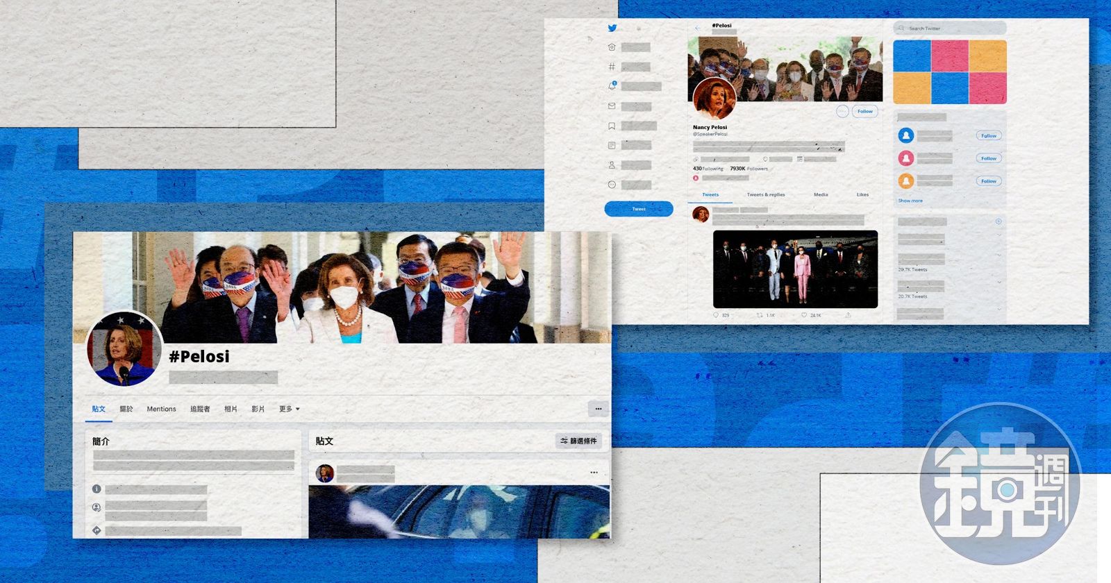 真實世界裡的緊張對峙,也呈現在虛擬世界的言論風向裡。READr 分析 Facebook 及 Twitter 有關裴洛西的討論,將內容分類為 12 個不同的主題,發現不論在 Facebook 或 Twitter,傾中言論數量皆高於其他主題,影響力卻不大,同時也發現網軍使用「人海戰術」的蛛絲馬跡。