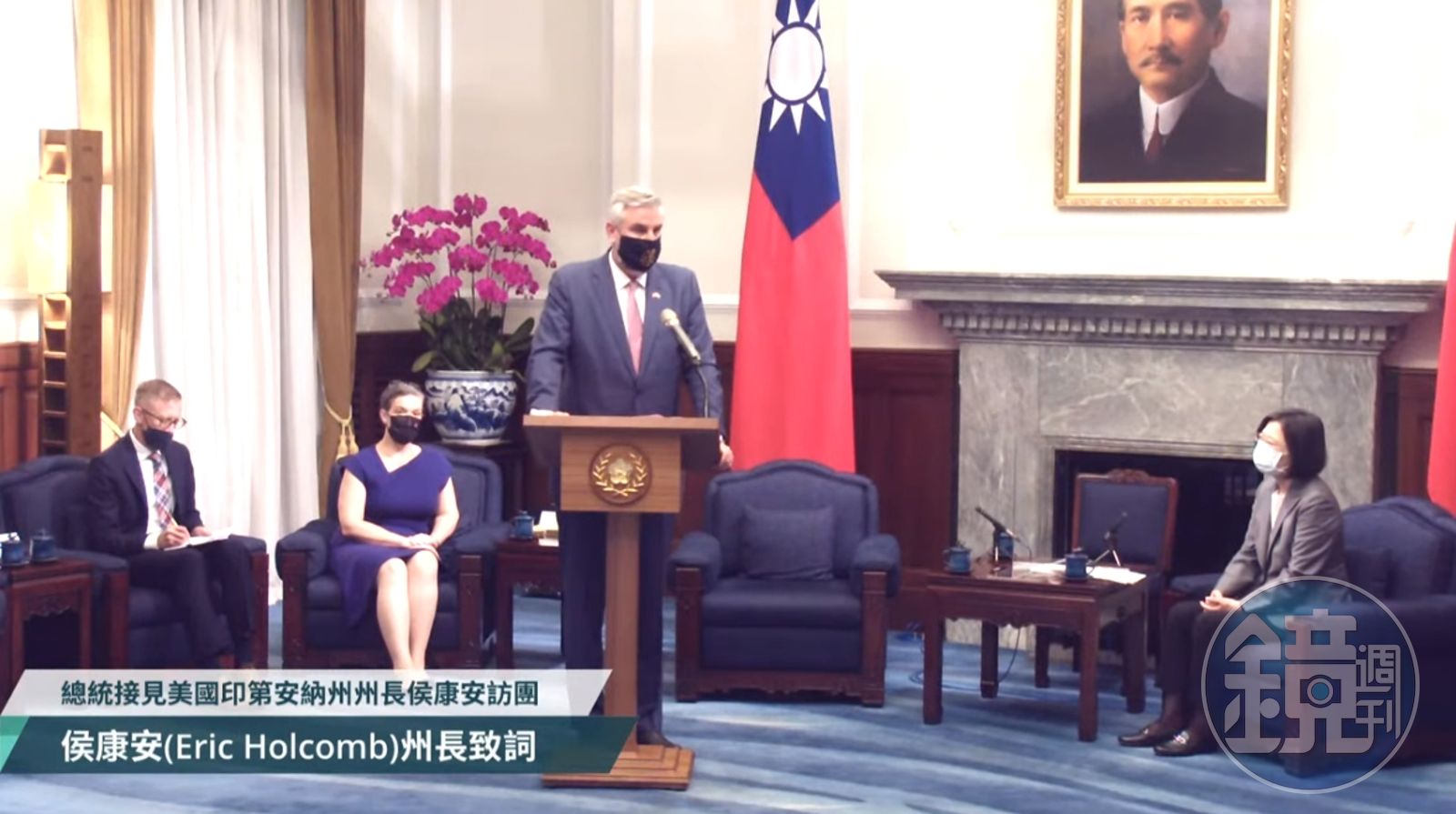 侯康安致詞時表示,很榮幸能和台灣的老朋友在一起,感謝總統與總統團隊的熱情款待,他代表680萬的州民向蔡總統致意,台灣與印第安納州的姊妹州關係已有44年的歷史。