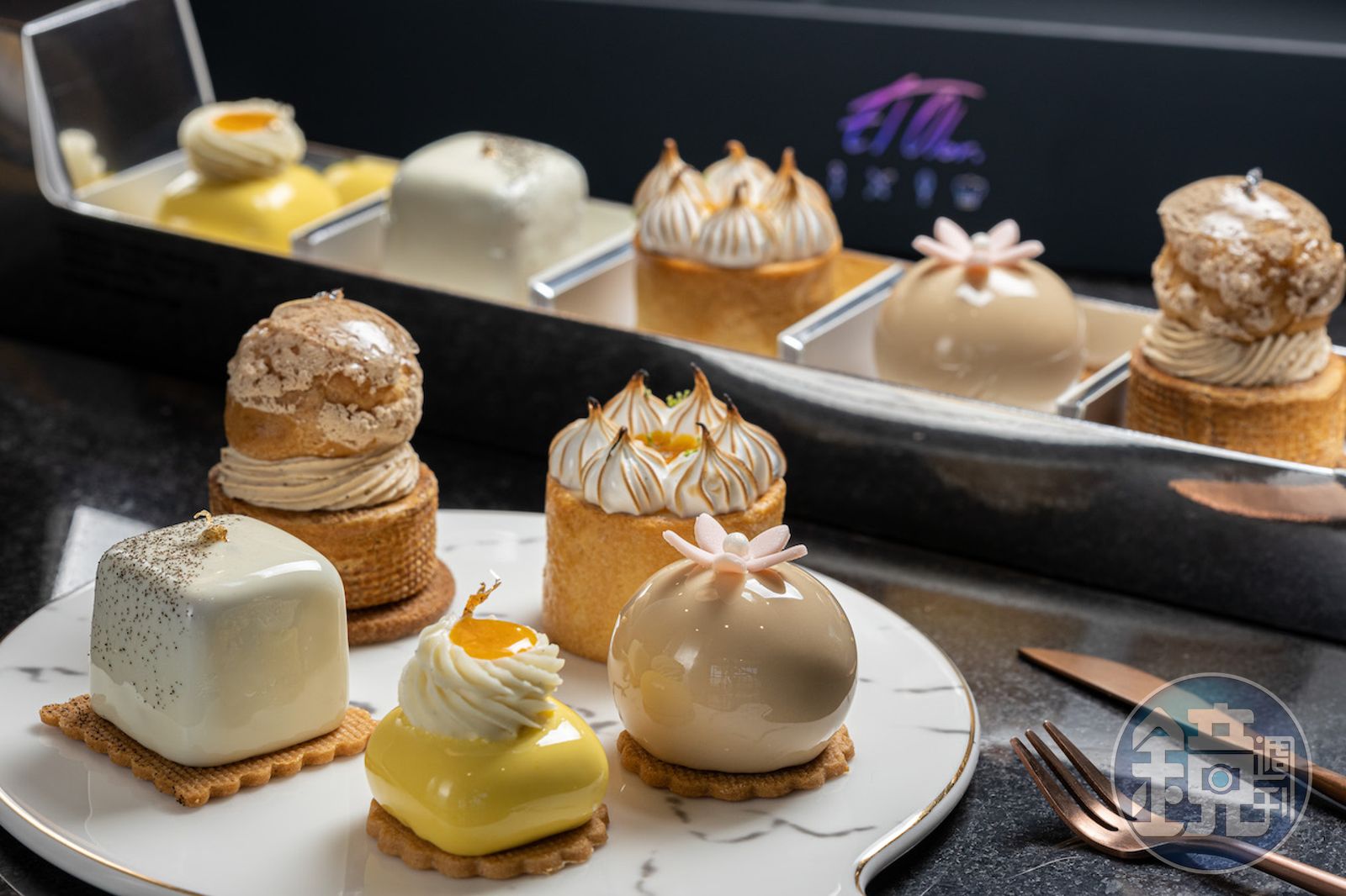 我想像收到這組禮盒的人,開箱見到「萌萌(分子檸檬塔)」「咚咚(冬瓜佛手柑慕斯)」「冉冉(芒果百香慕斯)」「啵啵(芋泥伯爵慕斯)」及「芙芙(皇家婚禮聖多諾黑)」共5顆法式甜點俏皮成列,眼球一定被吸住;先吃一口「啵啵」,可感受芋頭奶茶的醇香盈繞味蕾;再吃一口「冉冉」,則著迷濃滑酸美的口感。