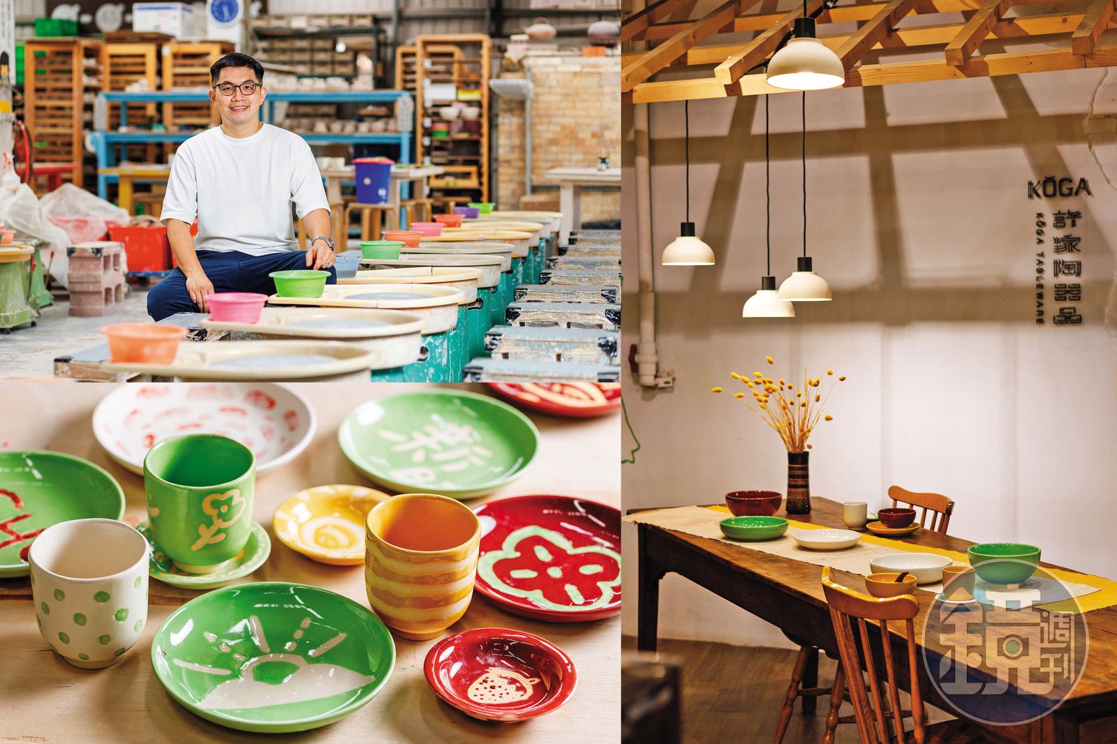 「KOGA許家陶器品」是新旺集瓷旗下新品牌,是在參與T22計畫期間,由中川政七商店協助成立,團隊在過程中發現,台灣較難找到適合台式料理習慣的餐具,便以此為靈感,發展出一系列包括適合擺放台式魚料理的橢圓腰子盤、能品嘗湯麵的大碗公,或是倒入有勾芡菜餚,湯汁也不會溢出的六角深盤等。