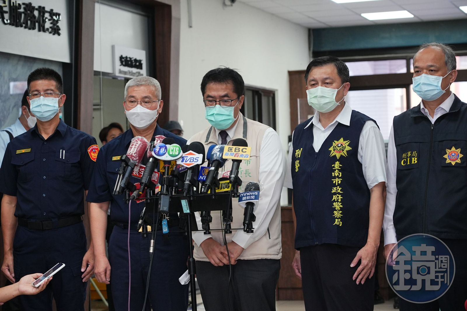 林信吾落網後,台南市長黃偉哲今早抵達第三分局召開記者會,先是替殉職員警默哀1分鐘,接著表示台南市警方動員了大批警力,在17小時內逮捕嫌犯以告慰2名殉職員警的在天之靈,但對於破案「所有警察同仁都沒有一絲喜悅」,因為他們失去了英勇、優秀的年輕同僚。