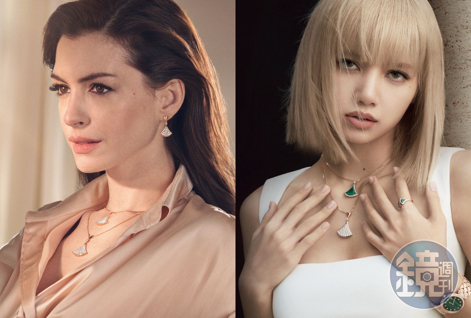 (左起)安海瑟薇(Anne Hathaway)與韓國女團BLACKPINK的成員LISA詮釋全新Divas’ Dream系列珍珠母貝以及孔雀石版本作品。(寶格麗提供)發布時間:2022.08.23 22:37 臺北時間