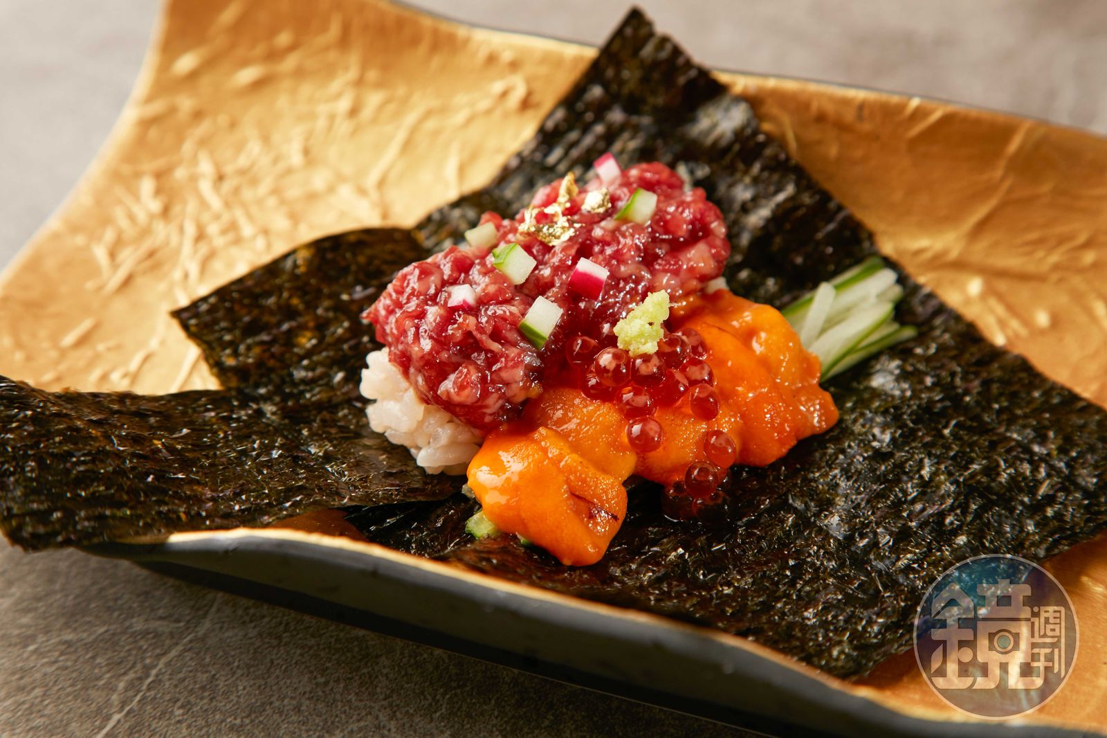 「和牛握壽司盛合」則是和牛跨出燒肉舒適圈的吃法,以生和牛搭配多樣頂級食材,如台灣產烏魚子、炙燒星鰻、北海道生干貝、鹿兒島青甘魚、西班牙伊比利豬、車海老、義大利魚子醬等,與日本秋田縣產「秋田小町」壽司米製成握壽司組合,呈現和牛新風味。