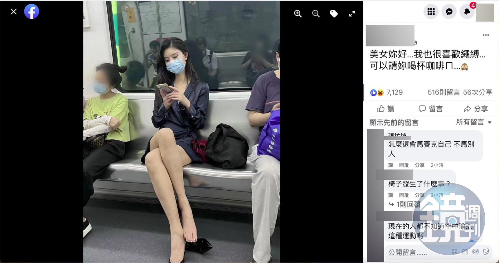 一名OL因高顏值加上一雙逆天長腿,搭地鐵時被對面乘客拍下,並分享在臉書「爆廢公社公開版」,由於正妹腿上卻有神祕的繩痕,意外引起網友討論。不過有同好在底下打臉歪樓的網友,表示這痕跡「根本就是空中瑜伽所造成的」,要大家不要想太多。