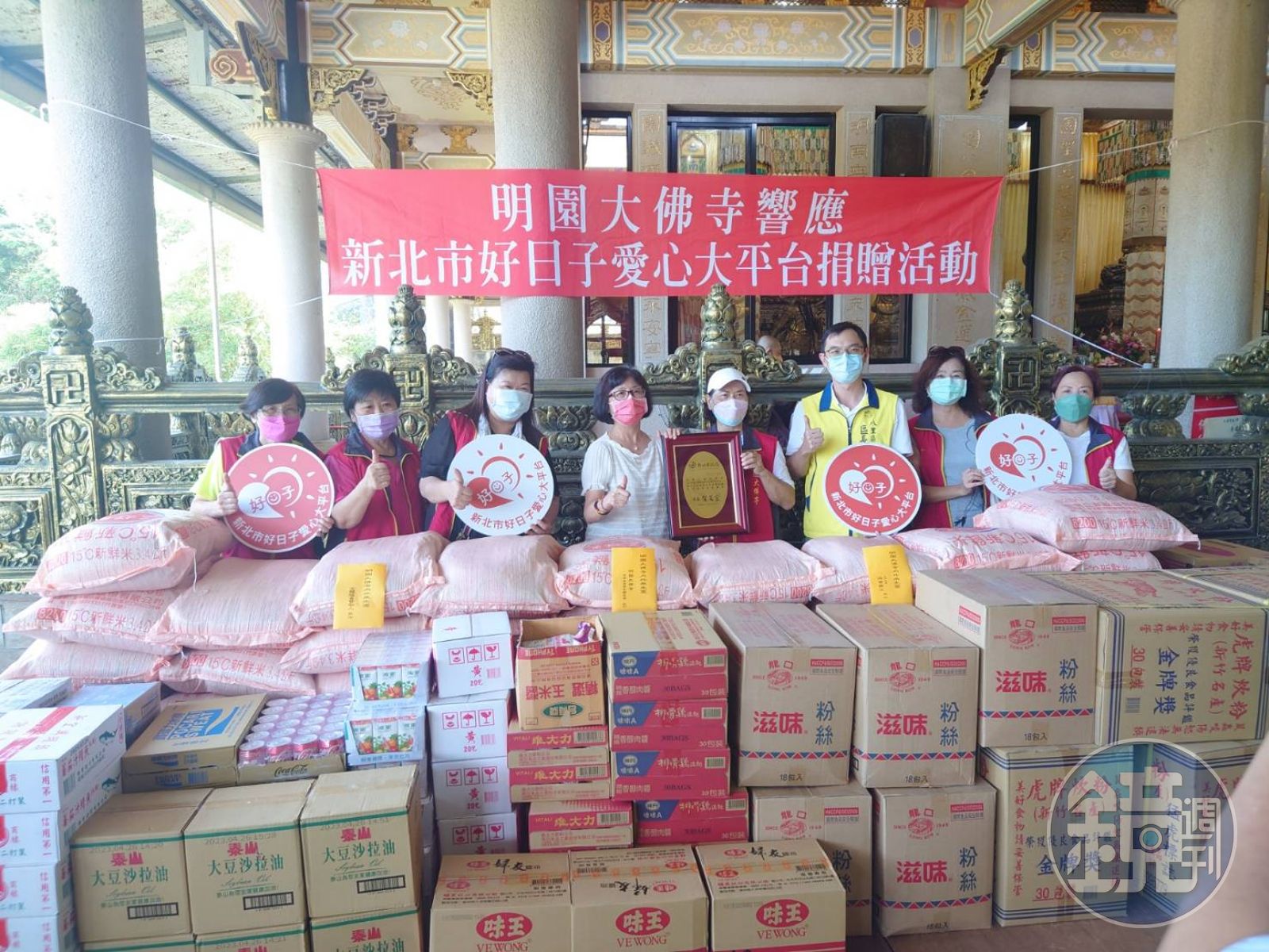 2019年後,明園大佛寺加入新北市愛心大平台,將信徒捐贈現金購買白米、麵條、罐頭、泡麵等後,交由新北市社會局愛心大平台統一整合。昨天明園大佛寺主任委員徐蔡靜江代表將信徒捐贈的2500公斤白米、飲料、餅乾、泡麵、麵條、罐頭等等,已經交給新北市愛心大平台,而此批民生物資將轉贈蘆洲及北海岸社福中心的經濟弱勢家庭。