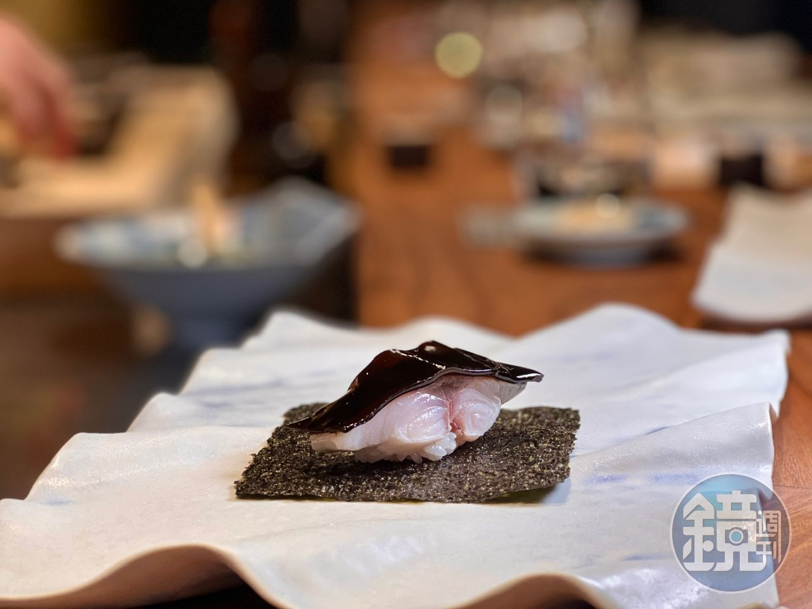 握壽司以日本漁獲為主,昆布醃漬鹿兒島小豆石斑、炙烤千葉金目鯛、醋橘九州白烏賊、宮城縣的黑鮪魚大腹及江戶前壽司「天王」──以醋與鹽醃漬處理的小鰶魚等13貫架構起承轉合。其中最特別的是「鯖魚壽司」,有點關西「松前壽司」的風格,將有豐厚油脂的鹿兒島鯖魚醋漬並烤過,再蓋上如果凍般晶亮的自製昆布與酥脆海苔一起入口,腴嫩魚身與帶甜感的醃漬昆布在口中融合,鮮味大爆發。