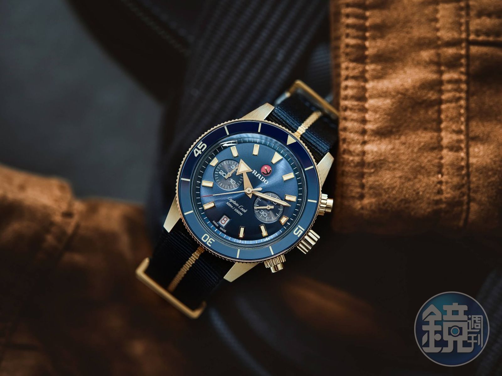 而之所以形容此次發表的計時碼錶是「旗艦款」,除了其功能最強之外,也因為其尺寸最大,價格最貴。此錶為43毫米的大型錶款,旋轉錶圈配有向內傾斜的藍色或黑色陶瓷嵌件,盒形藍寶石水晶錶鏡反射出極迷人的復古光芒,同時錶殼配上旋入式錶冠、按鈕和底蓋,而擁有達300米的防水深度。它共有三種不同版本,除了基本的精鋼黑面與藍面之外,最吸引人是還有一款青銅錶殼配上藍色面盤的版本。而且,因為採用了快拆式錶帶結構,每款手錶都可以變幻出三種錶帶的組合。