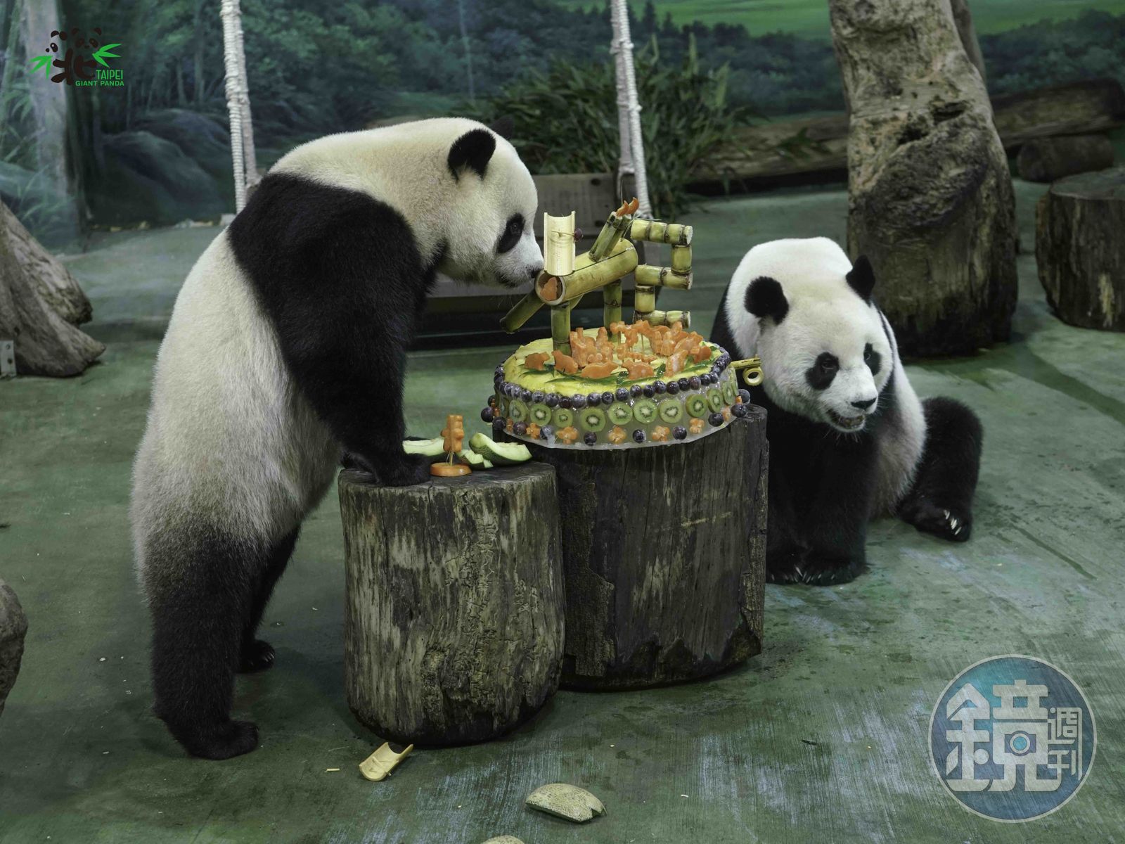保育員幫圓圓準備了「圓形」底座的蛋糕。(北市動物園提供)保育員今年為圓圓準備了「圓形」底座的蛋糕,團團則是「方形」底座的,充滿巧思,十分用心。今天上午動物園也在臉書直播「團團」和「圓圓」18歲生日慶祝活動,團團也在直播中大嗑美味的水果蛋糕。
