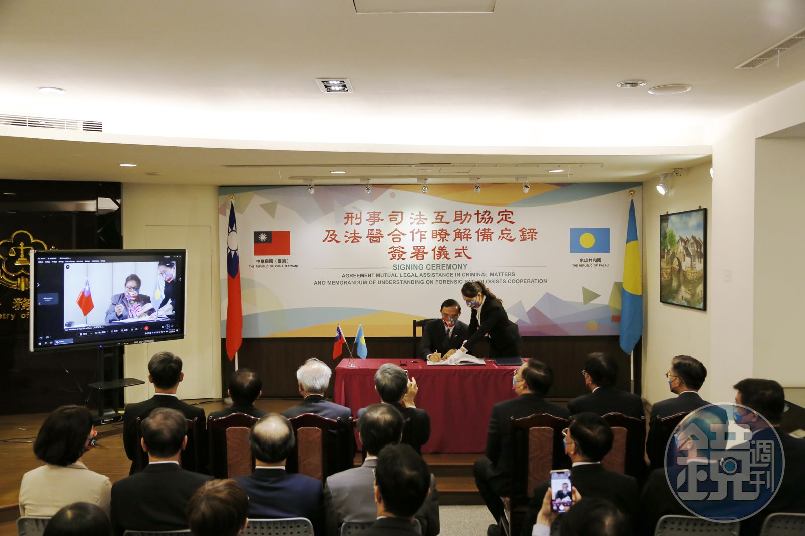 帛琉副總統兼司法部長席嫵杜率團來台,並在配合防疫規範下與本部蔡部長透過視訊簽署刑事司法互助協定及法醫合作瞭解備忘錄,外交部大使曾瑞利獲邀出席觀禮,見證兩國良好的交流互動延伸至司法領域及法醫合作,展現我國努力拓展司法外交具體成果。