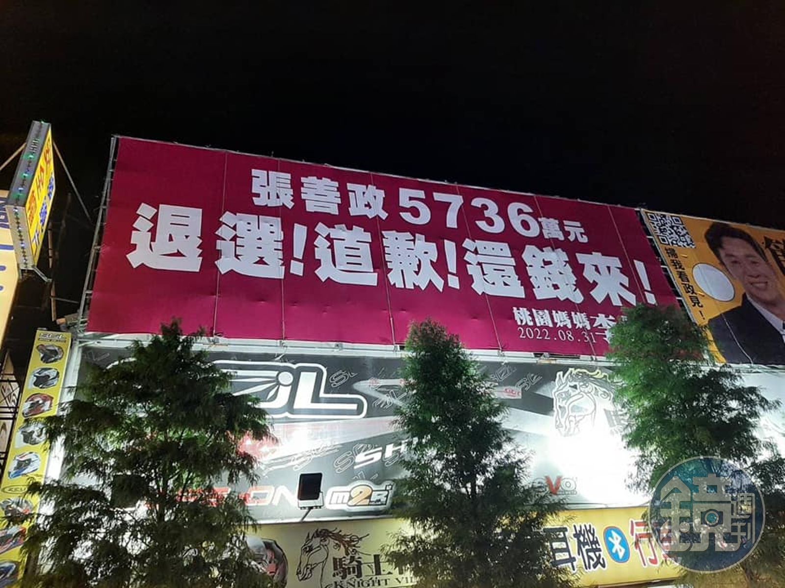 「桃園媽媽」李柏瑟立起巨型廣告,要求張善政道歉、退選、還錢!(翻攝自桃園媽媽-李柏瑟臉書)發布時間:2022.08.31 09:10 臺北時間