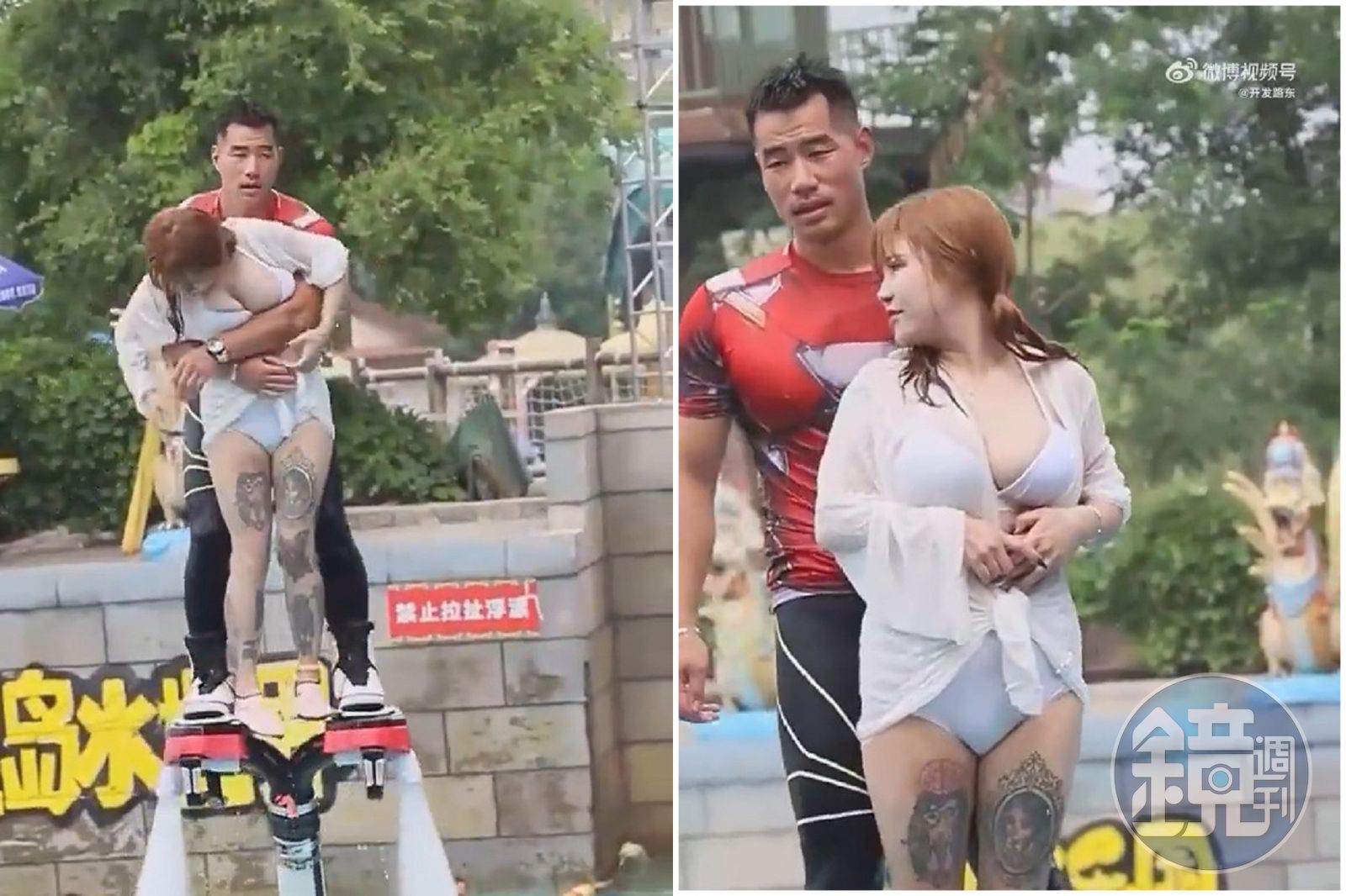 影片顯示,一名穿著比基尼的妹子,體驗水上鋼鐵人活動,但基於安全考量,有一名男教練隨身陪伴。就在兩人企圖取得平衡時,男教練也幫了妹子一把,從後方把她「熊抱」,試圖讓妹子不要跌下去。