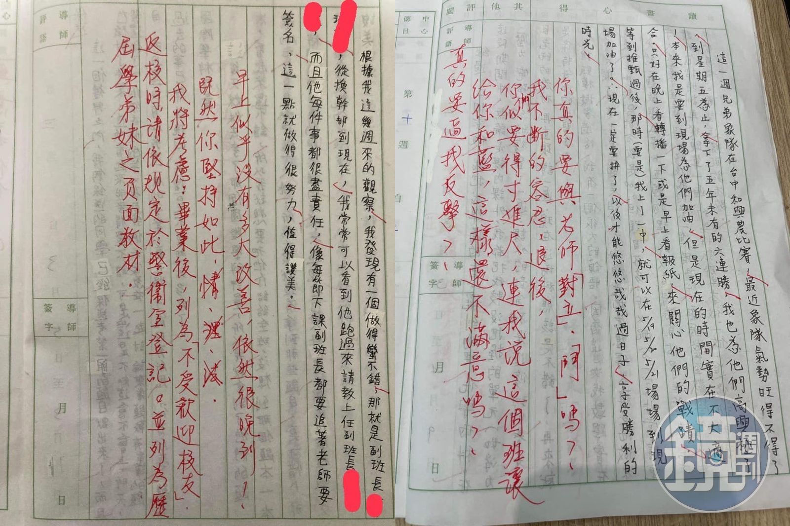 此外,黃師還規定學生週記需含4欄位:我的感謝、我的最愛、我的收穫及「我的最恨」,強迫學生寫下犯錯自白供自己謾罵。而從人本教育基金會南部辦公室公開的照片中,可見黃師於學生週記寫下「你真的要與老師『對立』、『鬥』嗎?我不斷容忍、退後,你們似要得寸進尺……真的要一步反擊?」「我將考慮:畢業後,列為『不受歡迎校友』……並列歷屆學弟妹之負面教材」等語帶威脅的評語。