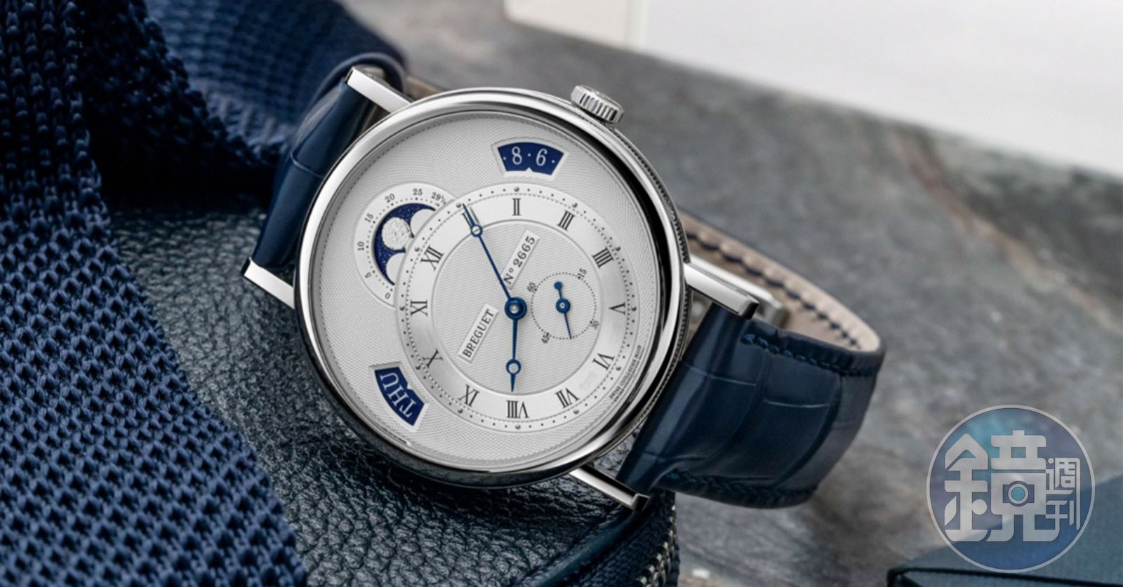 細看Classique 7337的錶面,會發現它的裝飾做得很細緻,整個面盤以機刻雕花的巴黎釘紋 (Clous de Paris)鋪底,中央以一環銀圈的羅馬數字刻度做出內外圈的區隔,寶璣式指針的時、分和小秒被劃分在內圈,而外圈則分成三個區塊,將視窗面積最大的月相放在置中位置,平衡了視覺上的配重,而十點鐘和兩點鐘位置,則分別是星期和日期的扇形視窗,做了一個三角形箭頭輔助視讀。另外,面盤最外緣還以機刻雕花麥穗紋裝飾,完美地為面盤做出收邊般的細膩效果。