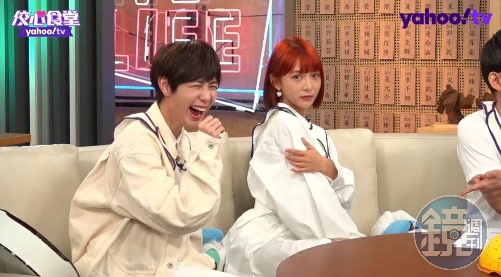 有趣的是,網友一下敲碗魏嘉瑩走甜美風,一下又想看她嘗試性感路線,魏嘉瑩秀出她學到一招Pose,把右手搭在左手手臂上,對著鏡頭放電,但她做得四不像,黃子佼看了一頭霧水,溫妮依樣畫葫蘆,同樣的動作竟呈現截然不同的氛圍,黃子佼吐槽魏嘉瑩的動作像是「打預防針」。