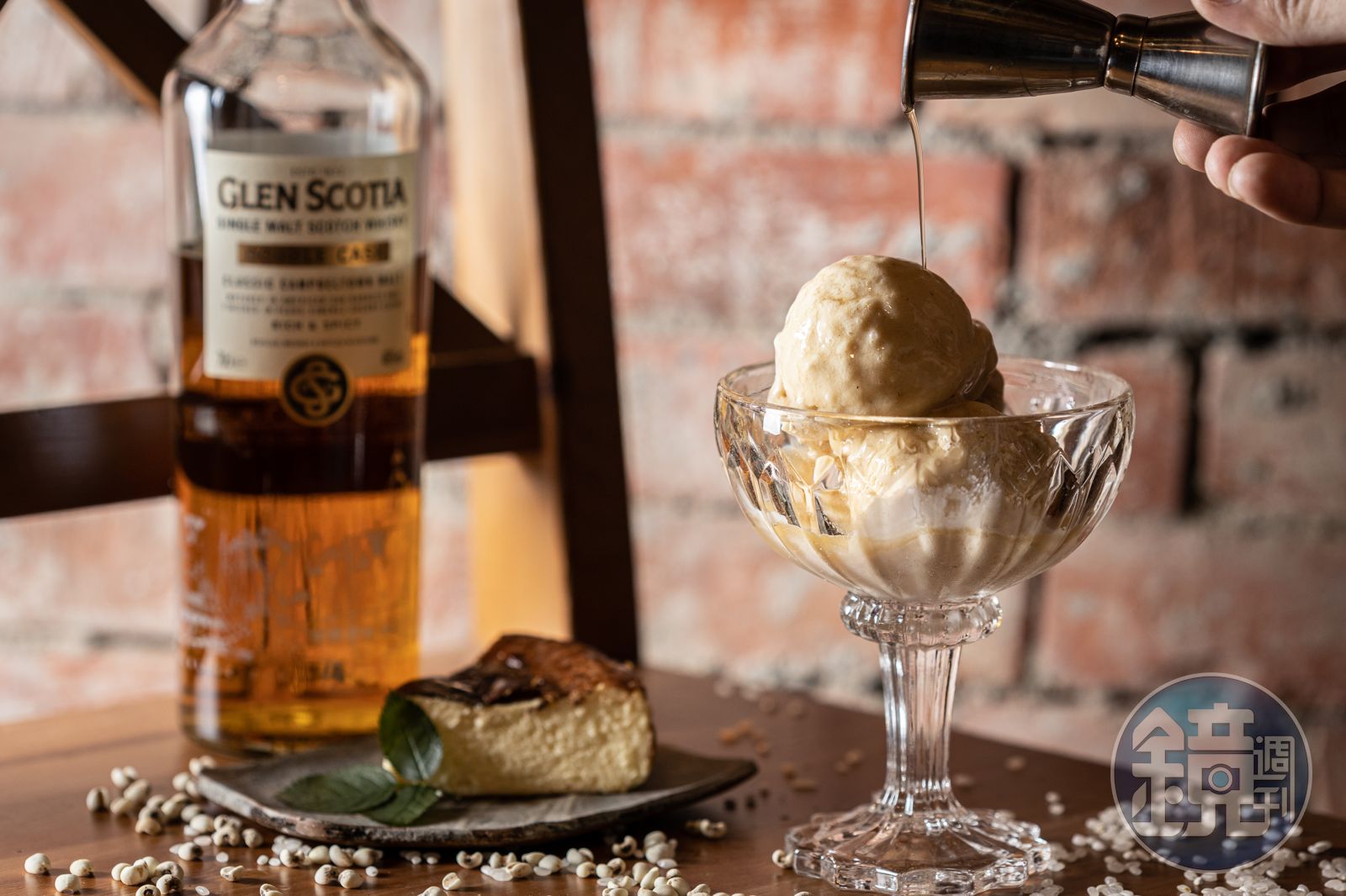 這種樸潤的「湯底」能與各種風味合作愉快,特別是氣味芳醇的洋酒。我覺得Bebop的獨到之處在於,即便因為法令限制,食品的酒精濃度不得高於0.5%,但他們卻能在冰中賦予非常濃郁且真實的酒香:蘭姆酒的香草香、波本的奶油焦糖感、蘇格蘭威士忌的橡木氣息,都被安排進各種即興特殊口味中,在挖冰入口瞬間隨著升溫被喚醒。覺得酒精感太淡不過癮?淋杯烈酒Shot,馬上變身大人系調酒甜點。