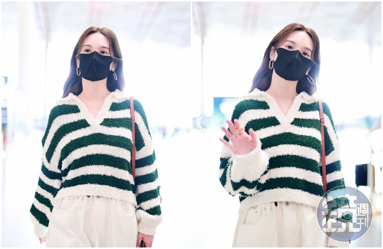 楊丞琳揮手回應沿路熱情送機的粉絲,但她雙眼無神, 整個人看來有點憔悴,疑似是被「海鮮之亂」受影響。