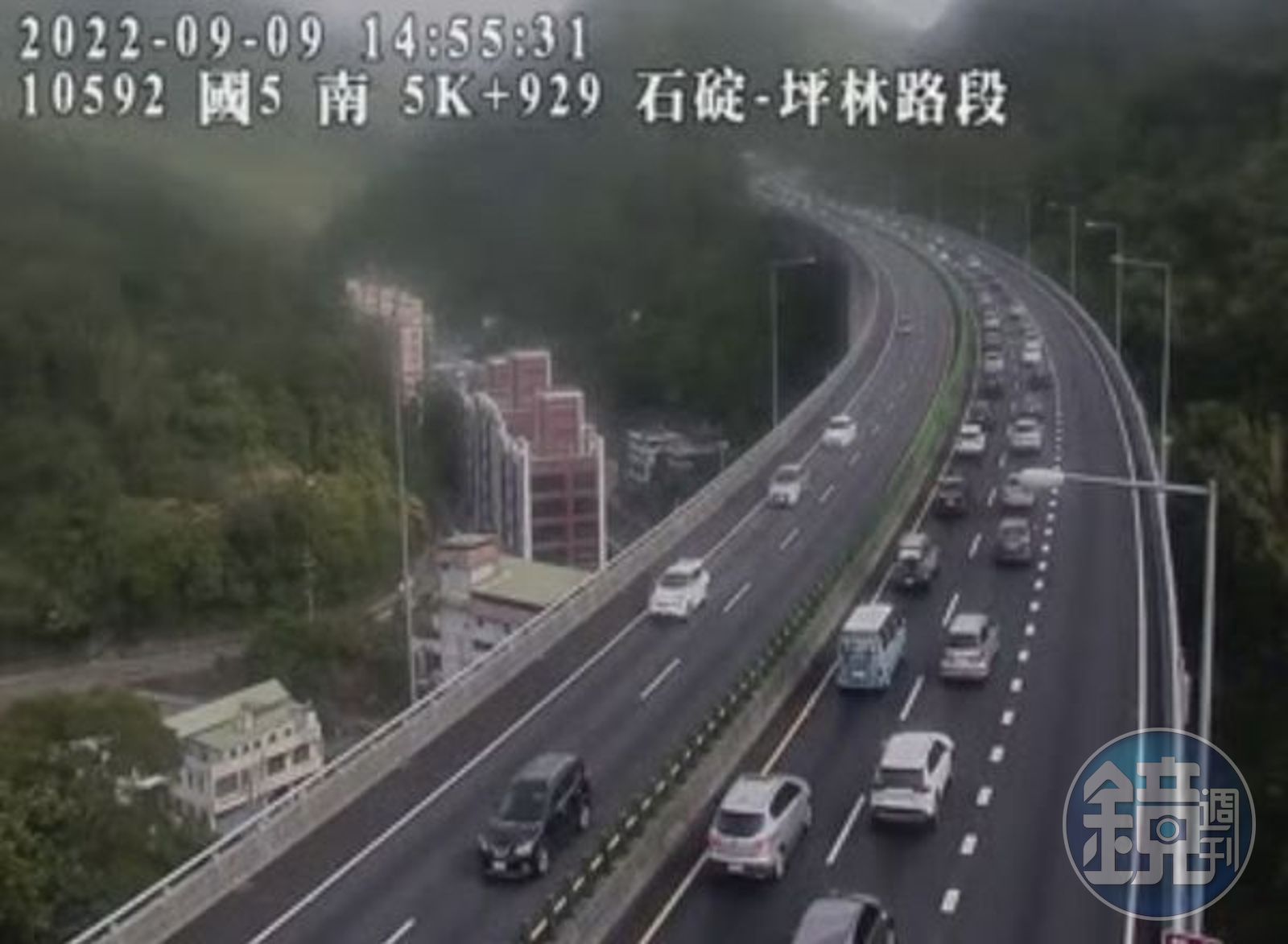 今連假首日國道塞爆,壅塞情況比疫情前多,自清晨一路塞到下午,午後再出現一波南下車潮,國5下午南下路段已較上午壅塞。