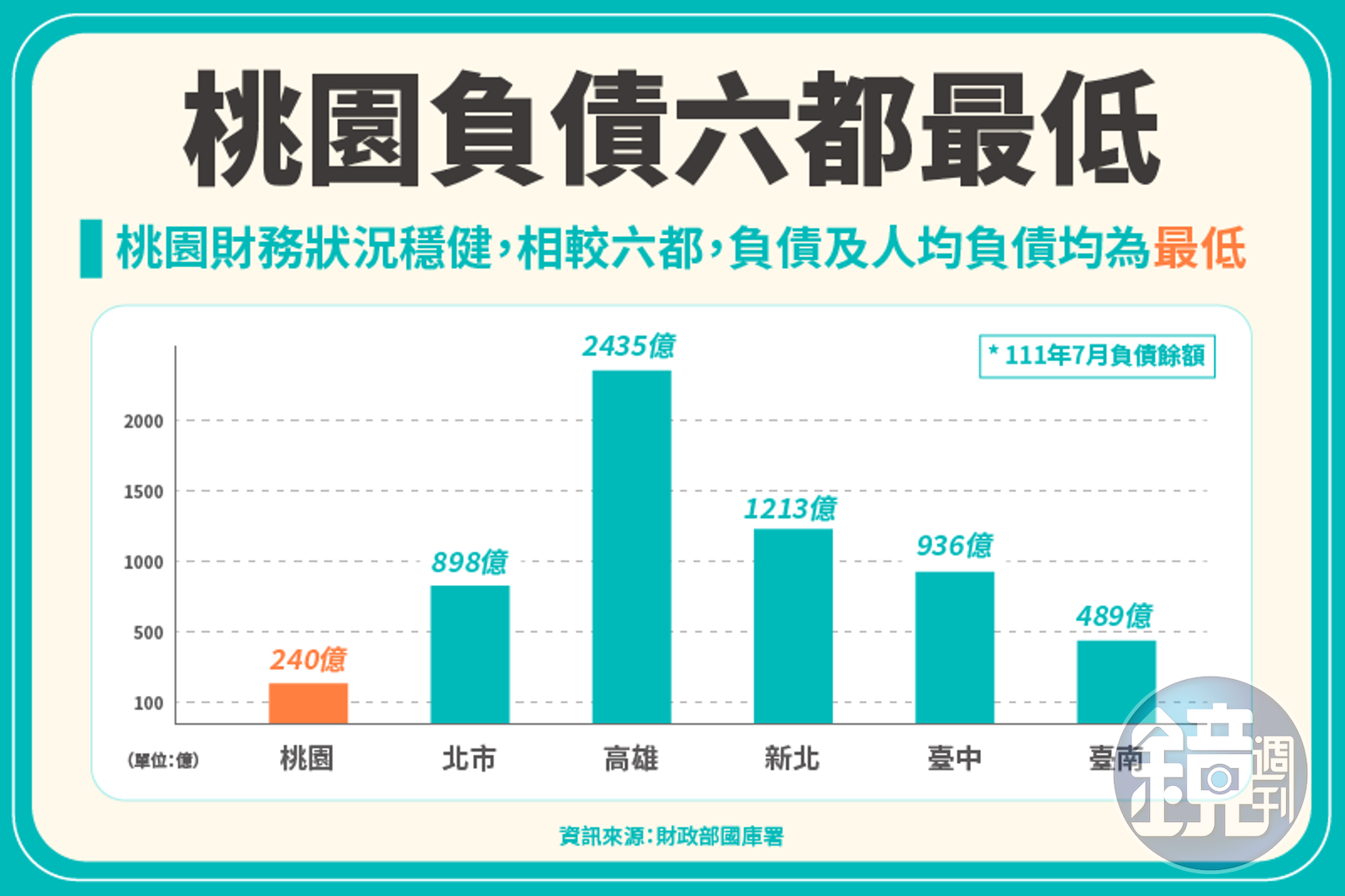 桃園市政府表示,依《公共債務法》規定,納入法定債限之債務是指長短期借款及透支款項,截至今(111)年7月底止,桃園市債務餘額240億元、人均負債1.06萬元,對比其他六都數據:高雄市債務餘額2,435億元、人均負債8.94萬元;新北市債務餘額1,213億元、人均負債3.05萬元;台中市債務餘額936億元、人均負債3.34萬元;台北市債務餘額898億元、人均負債3.64萬元;台南市債務餘額489億元、人均負債2.64萬元,一直以來桃園市債務餘額及人均負債皆為六都最低。但另一方面,桃園改制升格直轄市後,受限於102年《財政收支劃分法》訂定的不平等規範,桃園市每年獲配財源數(中央普通統籌分配稅款及一般性補助款)均為六都之末,104至111年獲配財源合計2,062億元,8年計算下來比台南市少677億元、比台中市少741億元、比新北市少1,097億元、比高雄市少1,451億元、比台北市少2,042億元。在獲配財源數較少的基礎下,勢必另行籌措財源才能辦理建設,在公債法的規範下,舉債是常見的財政手段。