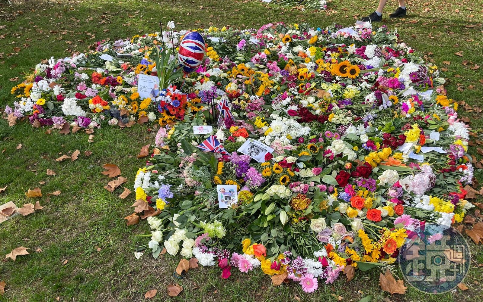 女王過世後,成千上萬的民眾到白金漢宮外頭送花、寫卡片、送玩具、蠟燭等,向他們最愛的女王致敬。官方早前表示,這些花、禮物、卡片等,會被轉送到白金漢宮附近的綠園(Green Park)供人欣賞,如今,占地19公頃的綠園已成花海。