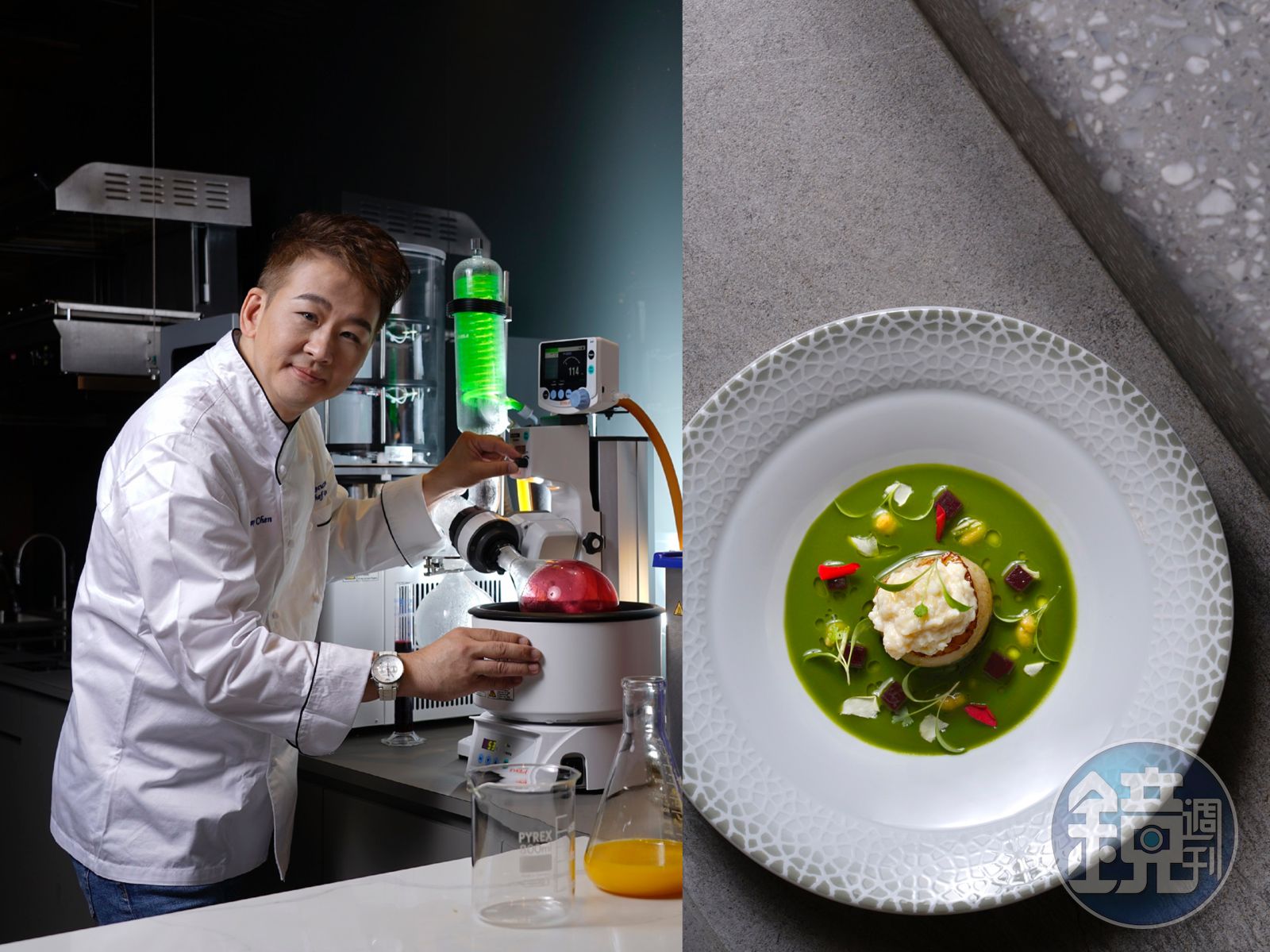 於是加入「CIMES君尹」後,他花費300萬投資研究實驗室專用的高階儀器,用科學的方法提取食物核心滋味,例如,「超音波震盪機」不僅用來低溫烹調,還用超音波穿透肉的組織,讓肉質更細嫩且保留風味;2個大燒瓶轉啊轉的「減壓濃縮機」需耗費5小時才能濃縮一種醬汁,原汁低溫蒸溜,萃取食材的隱味;「超低溫真空乾燥機」打造前所未有的乾燥食材口感;「奈米分離機」將所有液態醬汁,創造出細膩的空氣質地;「超高速離心機」不僅將固態液態分離,還能將食物原有色澤解離,達到澄清但保有香氣的液體狀態。