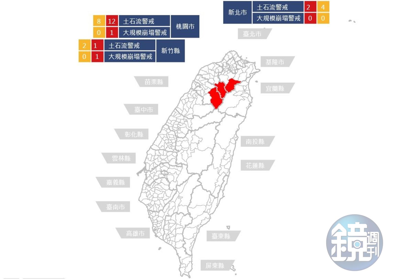 至於2處大規模崩塌紅色警戒則是桃園市復興區華陵里、新竹縣尖石鄉秀巒村;水保局說明,黃色警戒為預測雨量大於土石流警戒基準值,地方政府應進行疏散避難勸告,紅色警戒則是實際降雨已達土石流警戒基準值,地方政府應勸告或強制居民撤離,並作適當之安置。