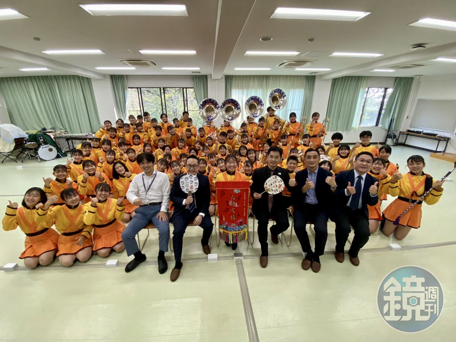 日本京都橘高校吹奏部成立以來首度來台參與國慶表演,也是台灣的國慶典禮首度邀請外國表演團體以近百人的大陣仗來台演出。文總祕書長李厚慶、慶籌會大會處長曹守全今日前往京都橘高校,親自向京都橘學園理事長梅本裕、中學校暨高等學校校長安田文彦遞送正式邀請函及「台日友好」錦旗,並贈予台灣的送鳳梨酥和馬祖高粱酒作為伴手禮向校方師生家長致謝。